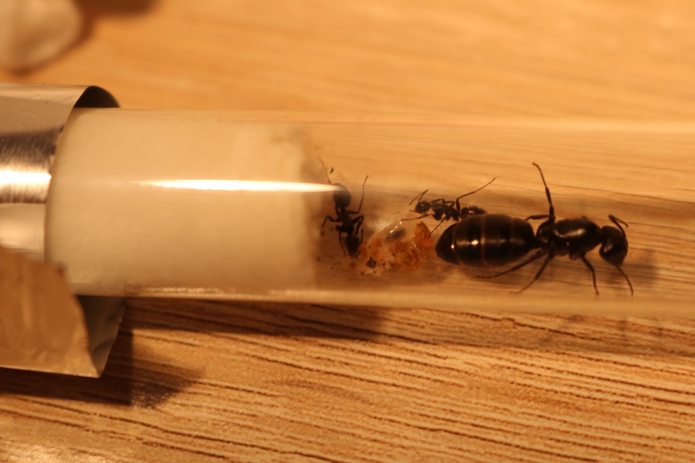 J'ai donc reçu une petite fondation composée de la gyne, de 3 ouvrières, d'une larve et d'un œuf. La première chose impressionnante, leurs tailles !! Moi qui étais habitué à des Crematogaster scutellaris, c'est du simple au double (au moins).
