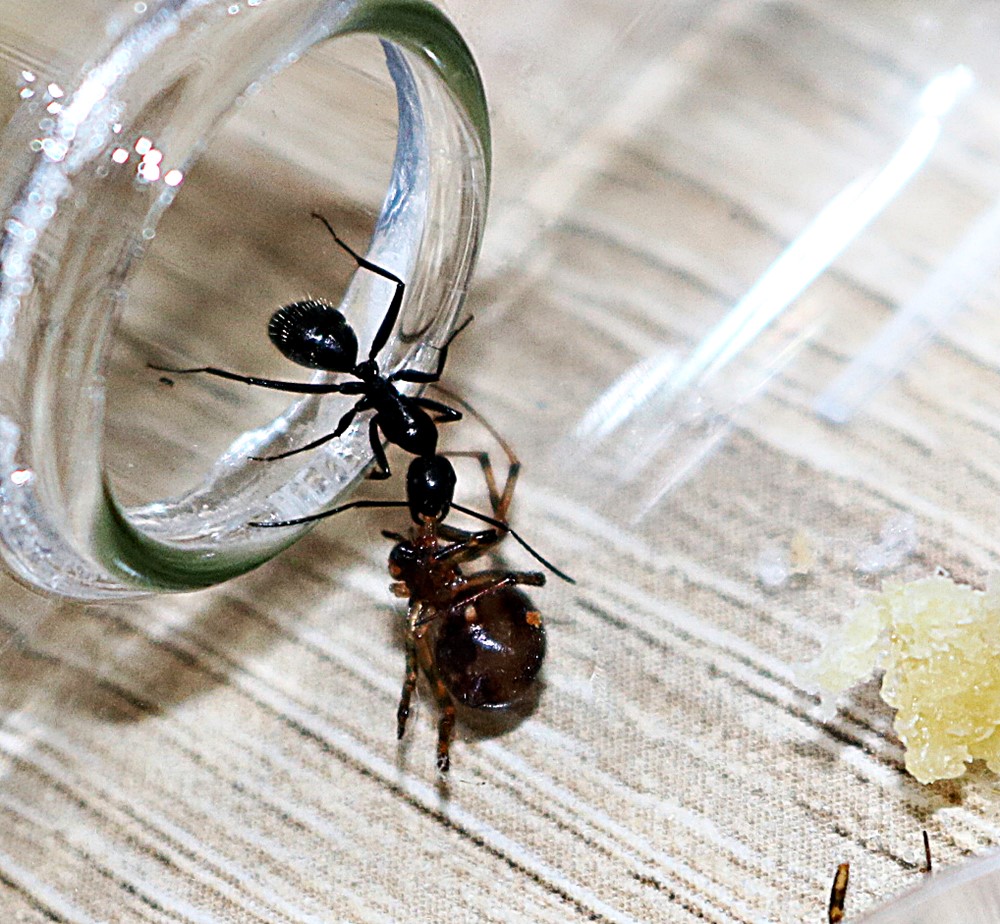 J'installe un petit abreuvoir avec de l'eau miellée et je dépose une mouche (préalablement congelée) dans l'Adc qu'elles se sont empressées de découvrir. Elles se sont jetées sur la mouche et l'ont totalement dévorée en moins d'une semaine. Je leur ai également donné une petite araignée mais qui après avoir fait des aller-retours dans le tube, a été laissée dans l'Adc. J'alterne les boissons entre eau miellée, eau sucrée, lait sucré, lait miellé etc.
