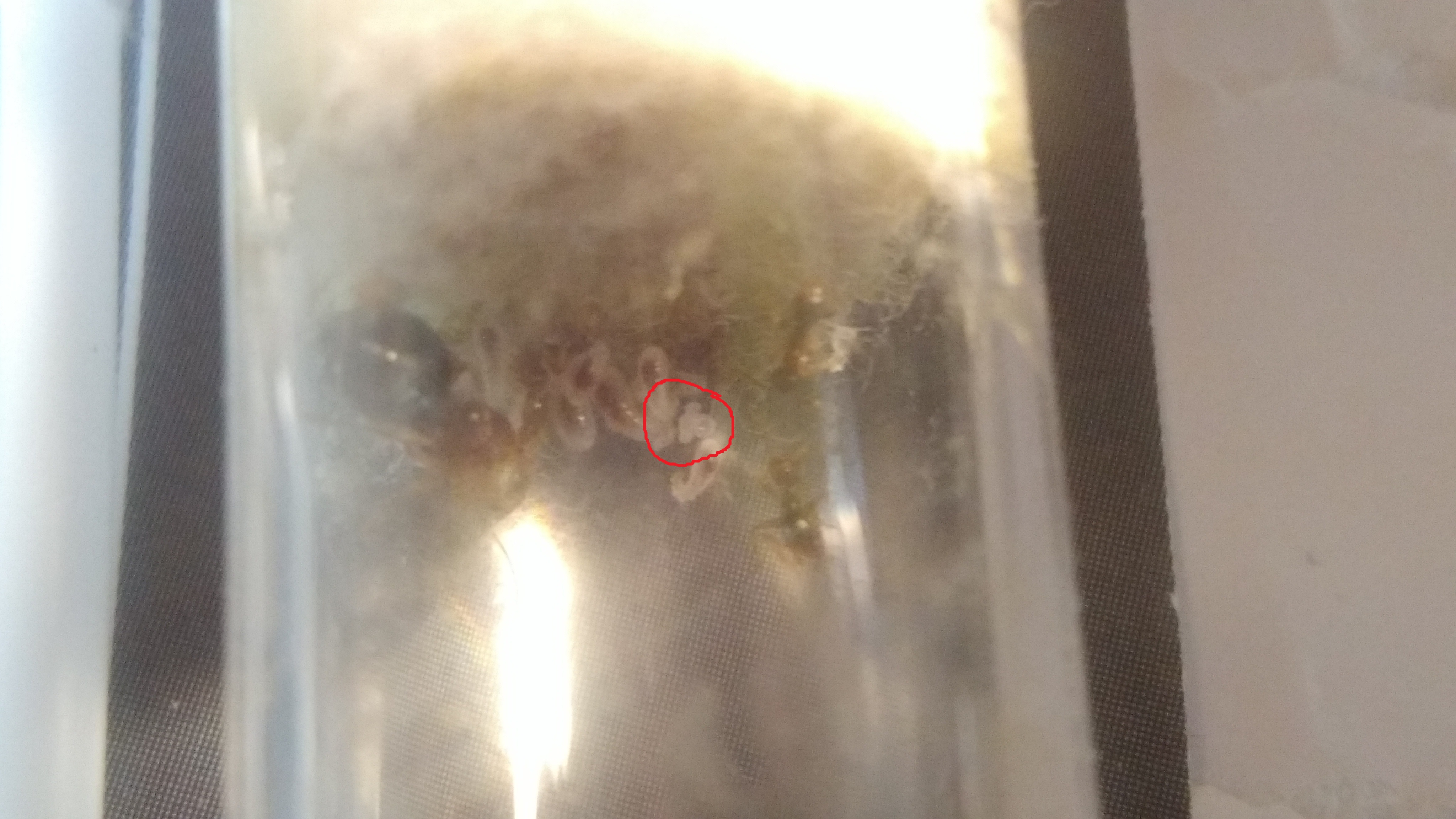 Bonjour, aujourd'hui je vais faire un suivi rapide de ma fondation d'Aphaenogaster subterranea. Je n'ai donc qu'une petite nouvelle à vous annoncer mais pas des moindres : la gyne a re-pondu, il y a environ 5 à 8 œufs et les ouvrières sont toutes folles.