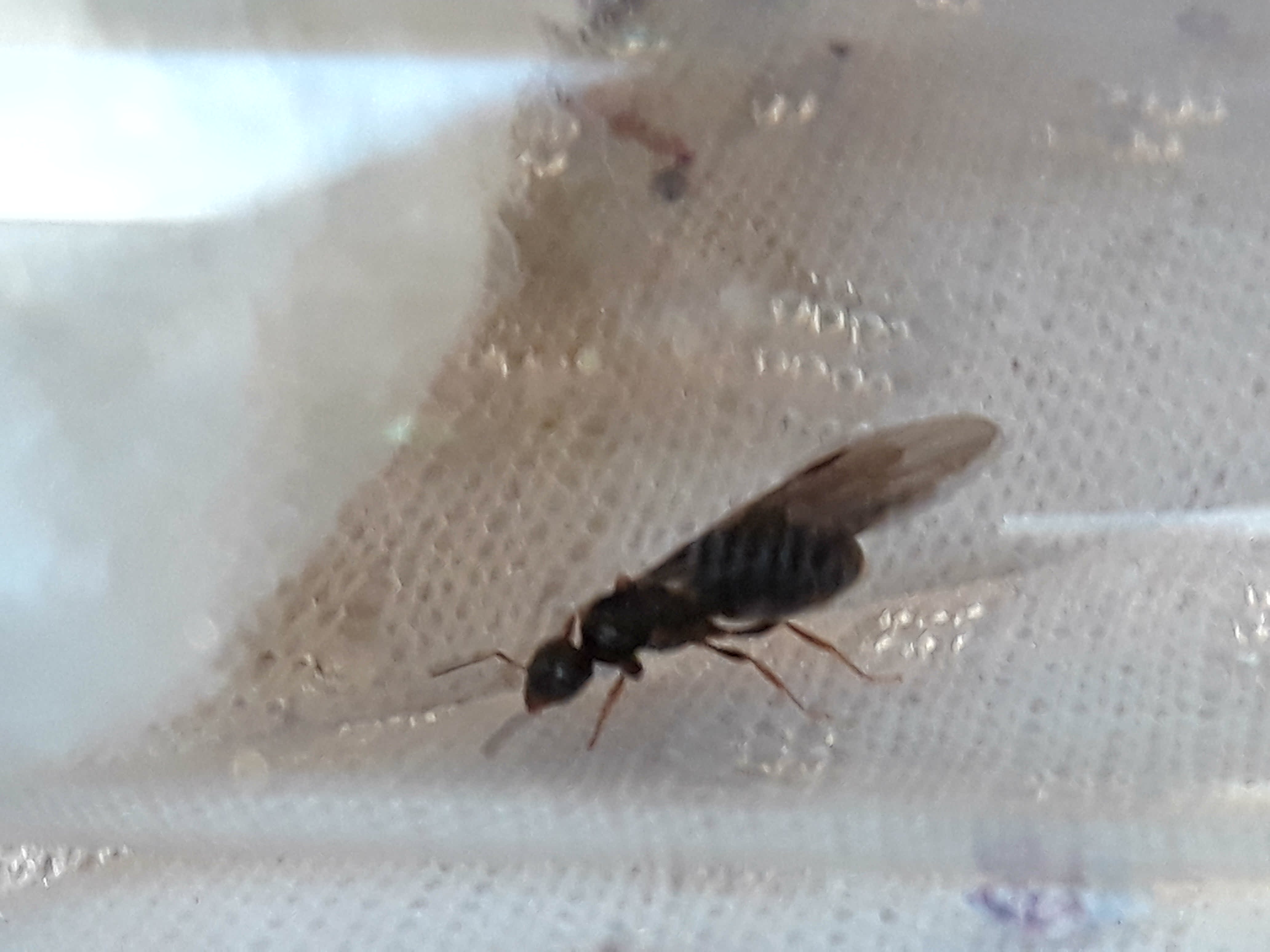 Je viens de trouver cette gyne en balade sur le rebord de ma fenêtre. Le temps est orageux avec 25°C, de quoi ravir ces dames. Le corps est brun foncé et les pattes sont orangés. Ses ailes sont foncées au centre. Elle mesure 0.8 cm. Merci pour votre aide.