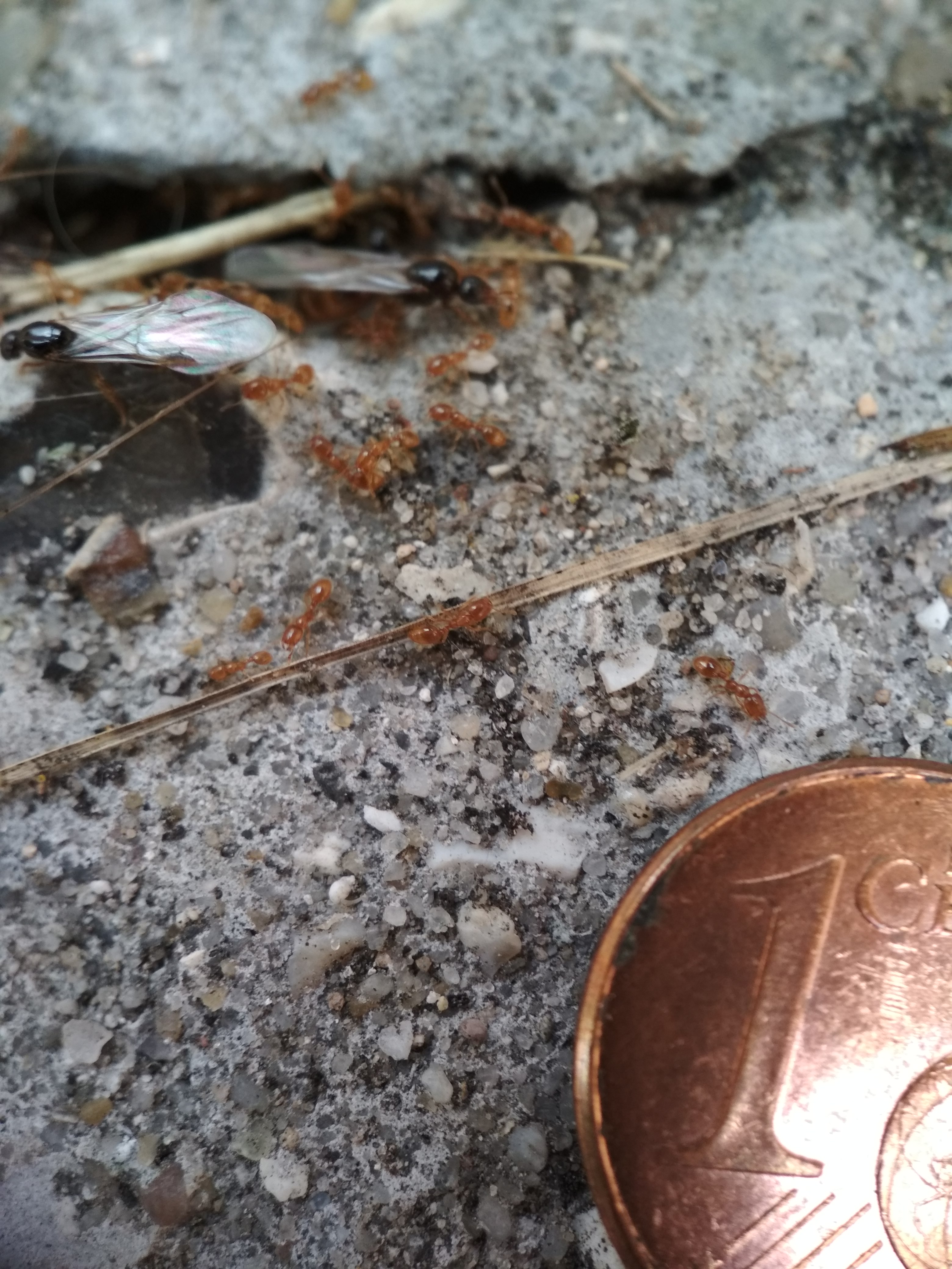 Je pense à Solenopsis peut-être fugax, mais l'essaimage a lieu en septembre octobre selon le Delachaux. Un essaimage précoce ? Qui sont ces toutes petites fourmis jaunes ?