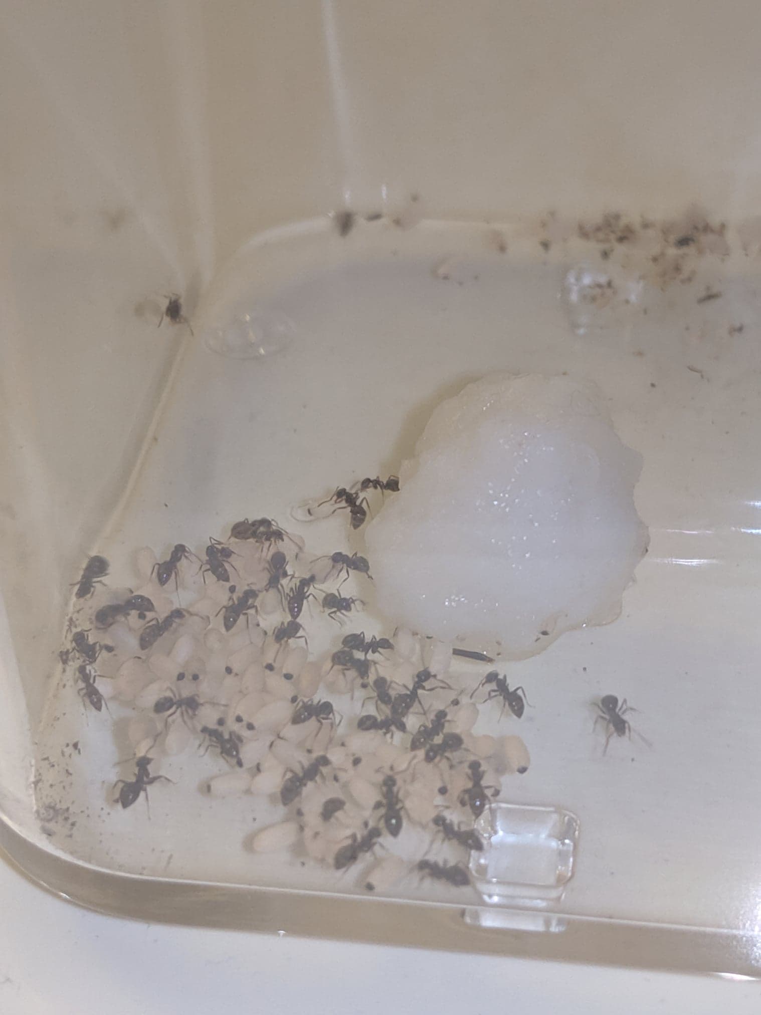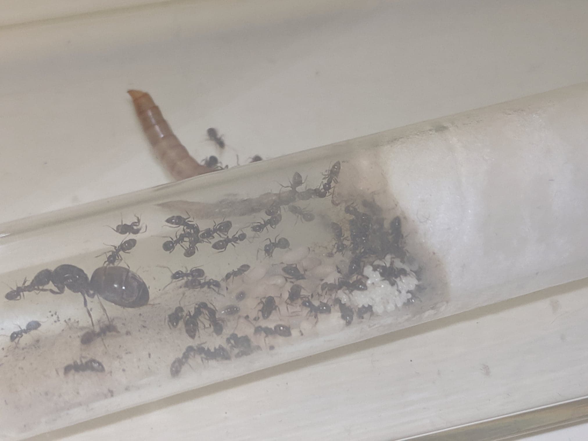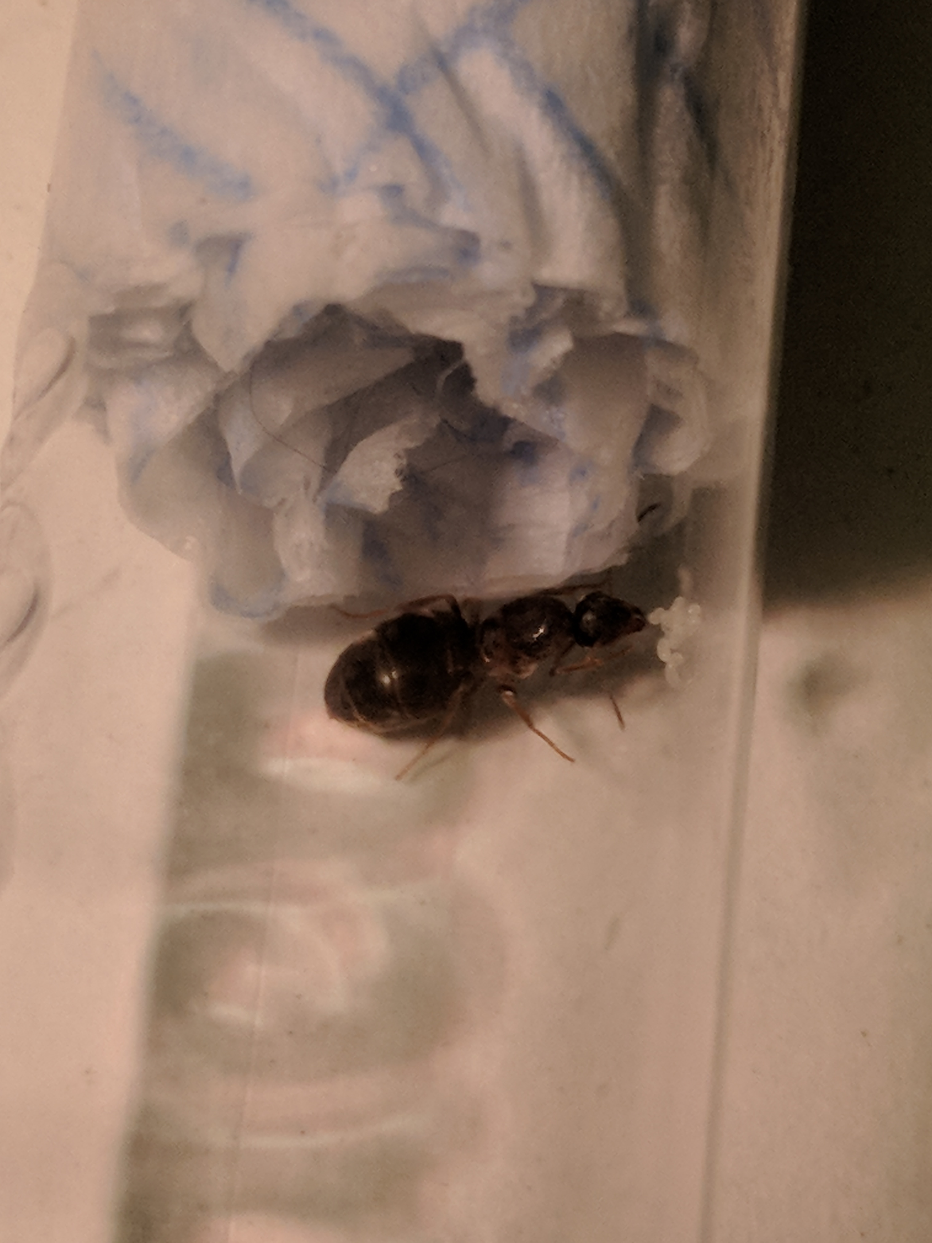 Aujourd'hui, la petite fondation est plutôt timide et apathique, mais apparement c'est normal. Les ouvrières ne sortent que très rarement, et de ce que j'ai pu observer, toujours seule (je n'ai pas toujours les yeux dessus, non plus