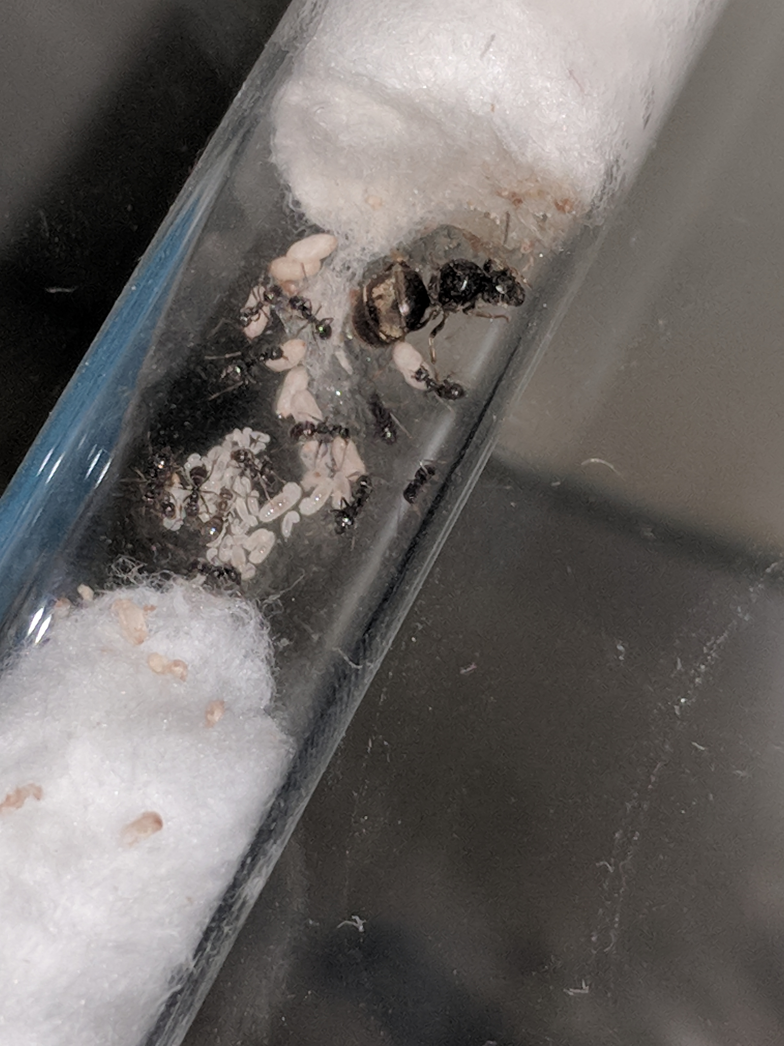 Aujourd'hui, la petite fondation est plutôt timide et apathique, mais apparement c'est normal. Les ouvrières ne sortent que très rarement, et de ce que j'ai pu observer, toujours seule (je n'ai pas toujours les yeux dessus, non plus