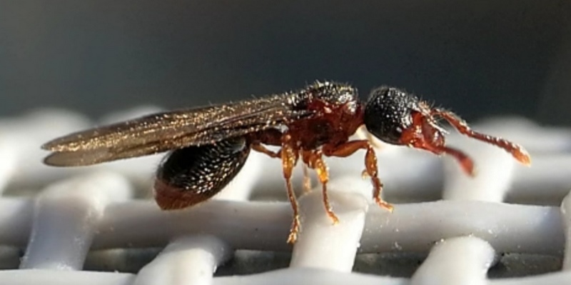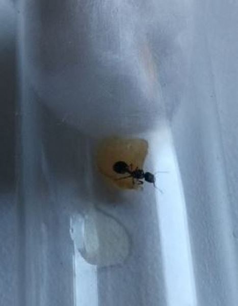 En sortant jeter un noyau de pêche, je tombe sur une gyne Myrmecina graminicola sans ses ailes en plein milieu du jardin ! Je la place alors en tube avec un morceau de pêche et une goutte de miel. Était-elle de sortie pour chasser car sa fondation est semi-claustrale, était-elle issue d'un essaimage récent ou bien était-ce une de ces gynes aptères ayant un rôle d'ouvrière ? Impossible de le savoir pour le moment.