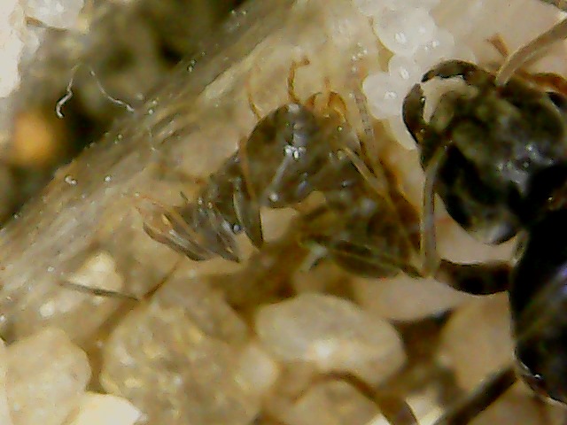 Ces dernières semblent apprécier leur nouvel espace et une des jeunes ouvrières entreprend un long déménagement... de sable. En effet, aujourd'hui il y a une quantité impressionnante de sable dans le tube ! Elles se sont créées leur petit nid il me semble avec même une sorte de pièce souterraine où elles doivent entreposer les œufs, je ne sais pas vraiment je n'ai jamais pu voir car la gyne se pose toujours dessus !