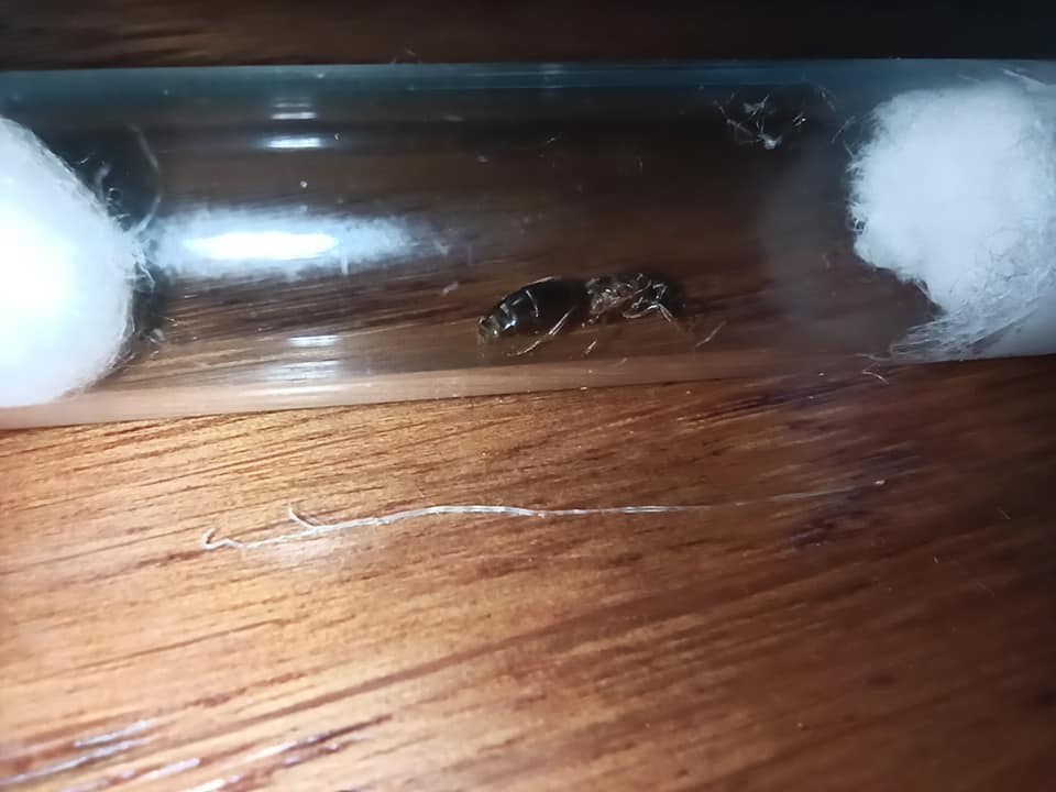Le message du membre était : " Gyne seule Lasius mal en point avec un fil de 4mm qui sort par derrière. Je la bloque et tire dessus. Je sors ça, un fil de facile 3 cm."
