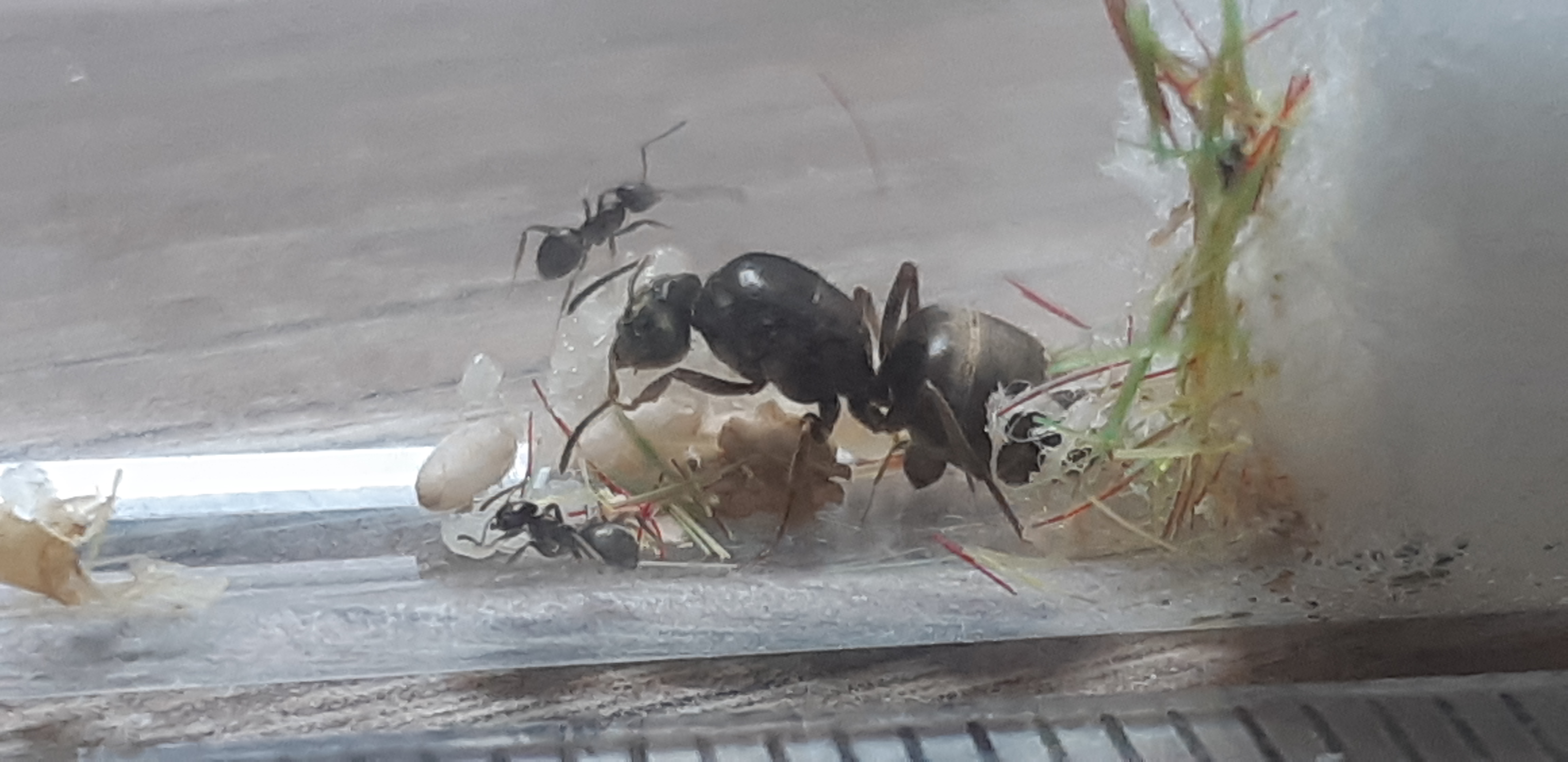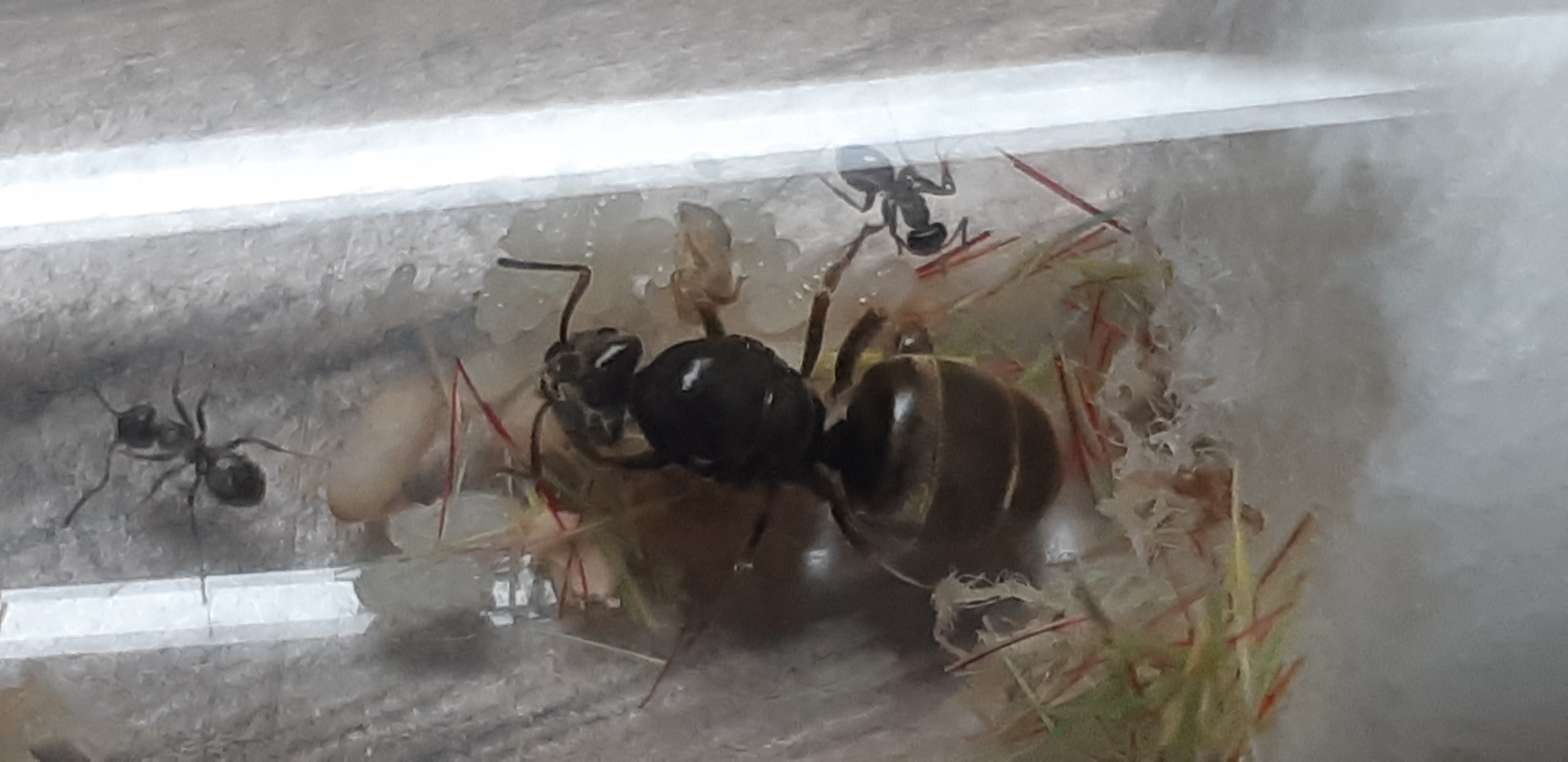 essaimage de centaines de fourmis ailées. J'en ai recueilli deux sur les pavés de la vielle ville et une dans les bois à proximité. Sur les trois une est morte lors d'une journée particulièrement chaude mais les deux autres ont bien pondu et ont déjà leurs premières ouvrières. C'est pourquoi j'espère que vous pourrez m'aider à identifier l'espèce car cela fait tout juste 1 an que j'ai commencé et à part les