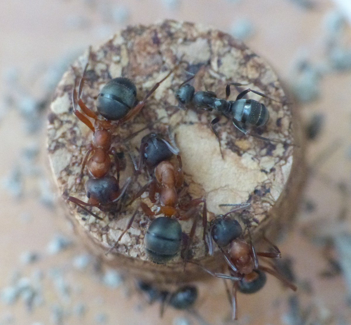 Pendant ce temps, les 2 ouvrières semblent reléguées au rôle de nourrices, sûrement en partie à cause de leur jeune âge. Elle ne sortent quasiment pas et ne montent pas la garde, la gyne s'occupe de tout. Celle-ci se poste maintenant souvent à l'entrée du tube, montant la garde parfois mandibules écartées, et en faisant de réguliers trajets vers le couvain.