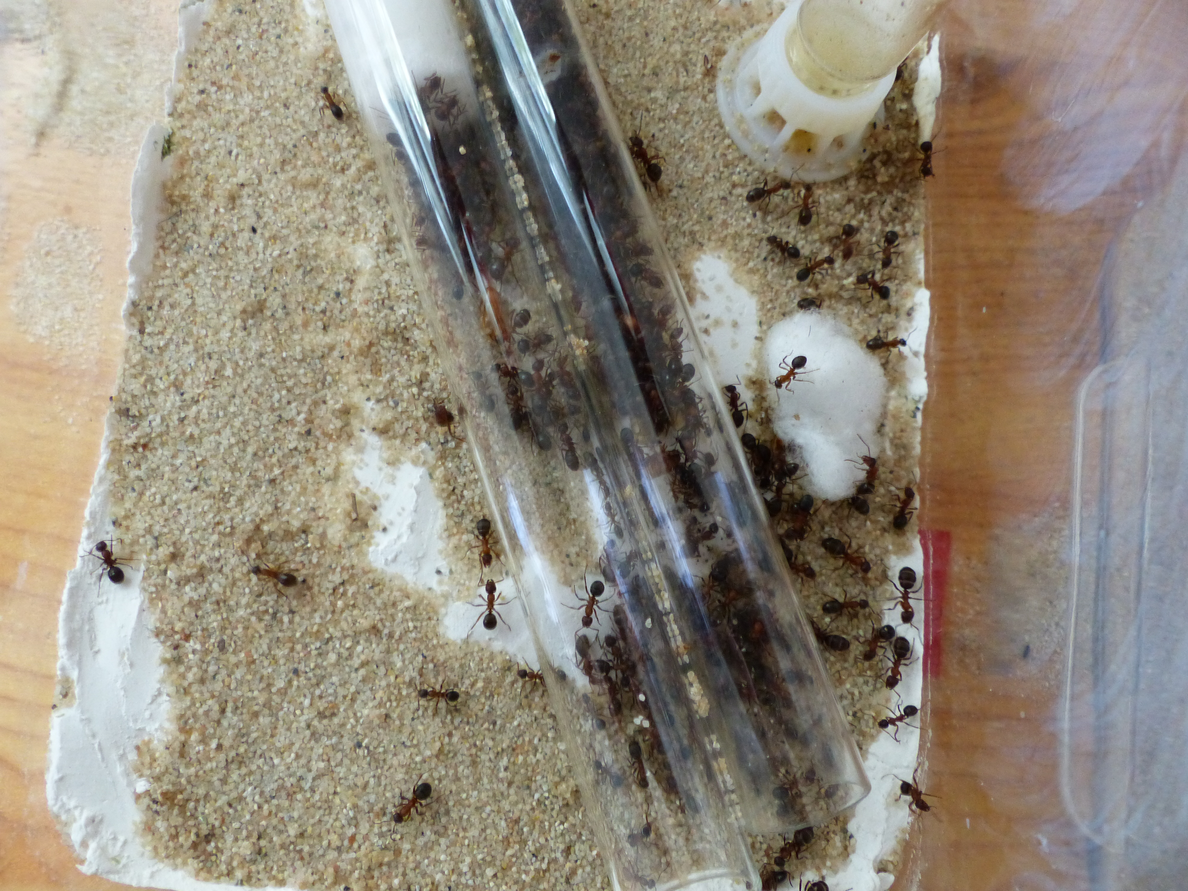 Une fois rentrés à Nice, la gyne et ses filles adoptives se portent toujours bien. Les 2 ouvrières ne sont toujours pas colorées. Il nous faut cependant les changer de tube, chose qui ce fera par la force. La gyne semble perdue et un peu affolée et court partout dans l'air de chasse sans trouver l'entrée du nouveau tube. Nous mettons donc une partie de son couvain, ses deux ouvrières, et elle-même dans le nouveau tube à l'aide d'une feuille de papier, puis le fermons et les laissons se calmer pendant une heure.