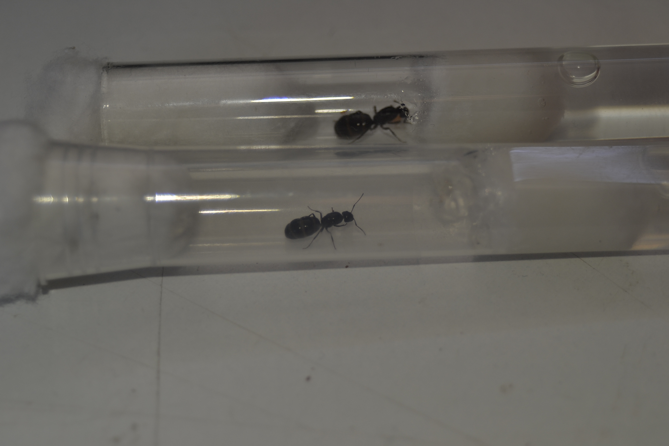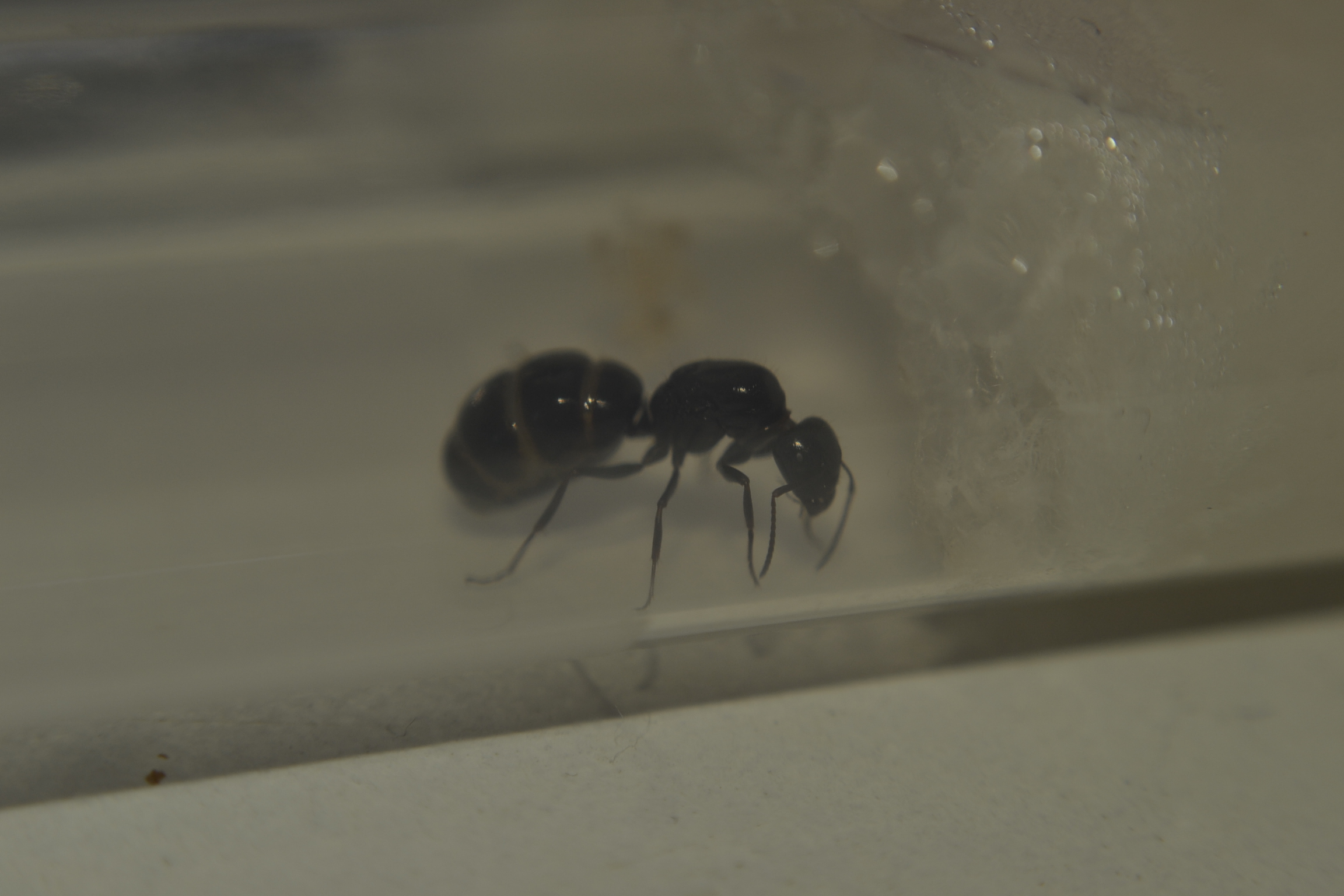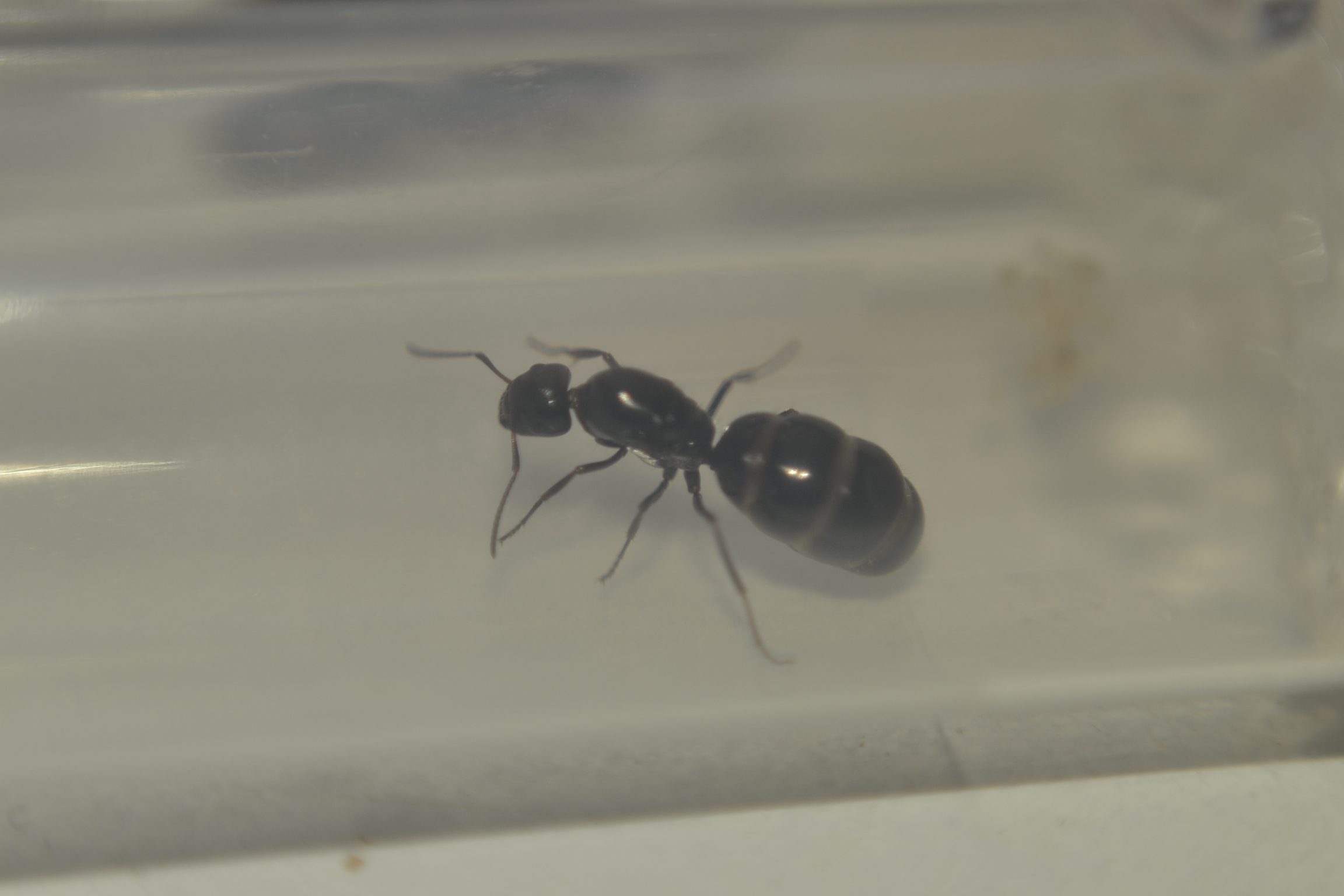Une photo comparative des tailles entre cette petite gyne et une Camponotus identifiée comme aethiops par les collègues.