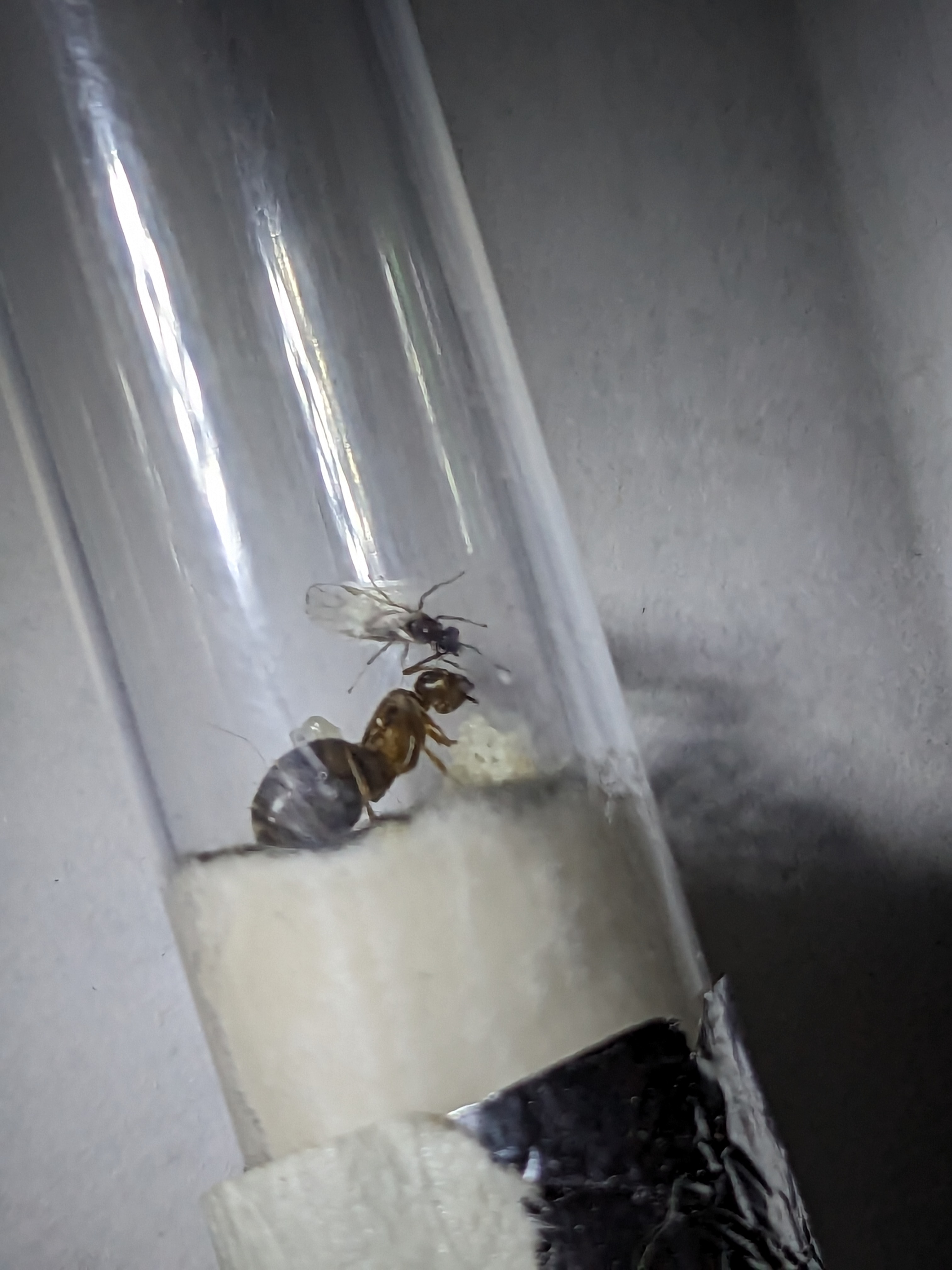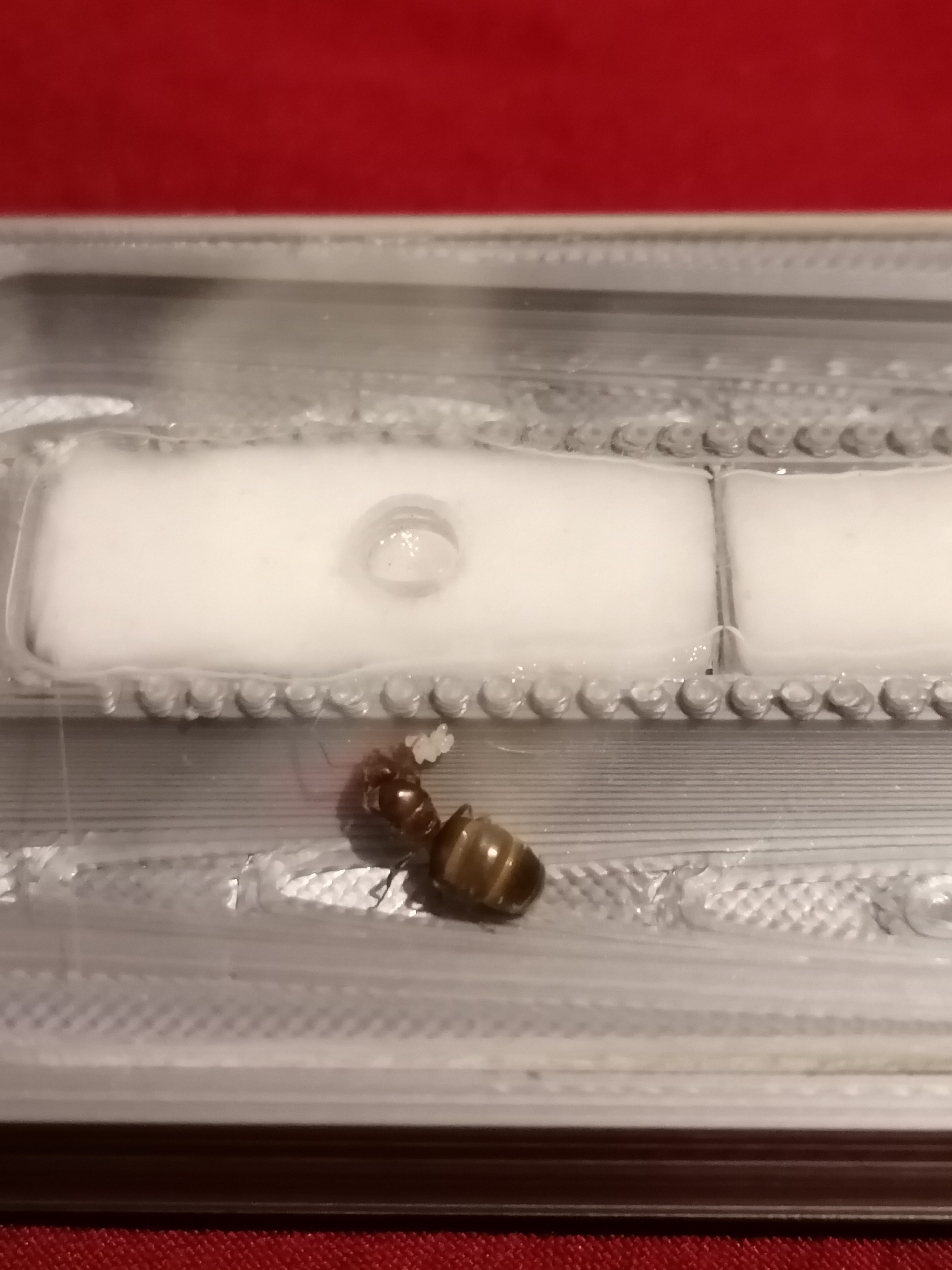 Je ne pensais pas trouver une gyne à mon travail, sur un établi inox avec divers produit pas forcément très bons pour les fourmis à proximité (éthanol, myristate d'isopropyl, etc.). Ni une ni deux, j'attrape la première boîte à ma portée et je la capture gentiment.