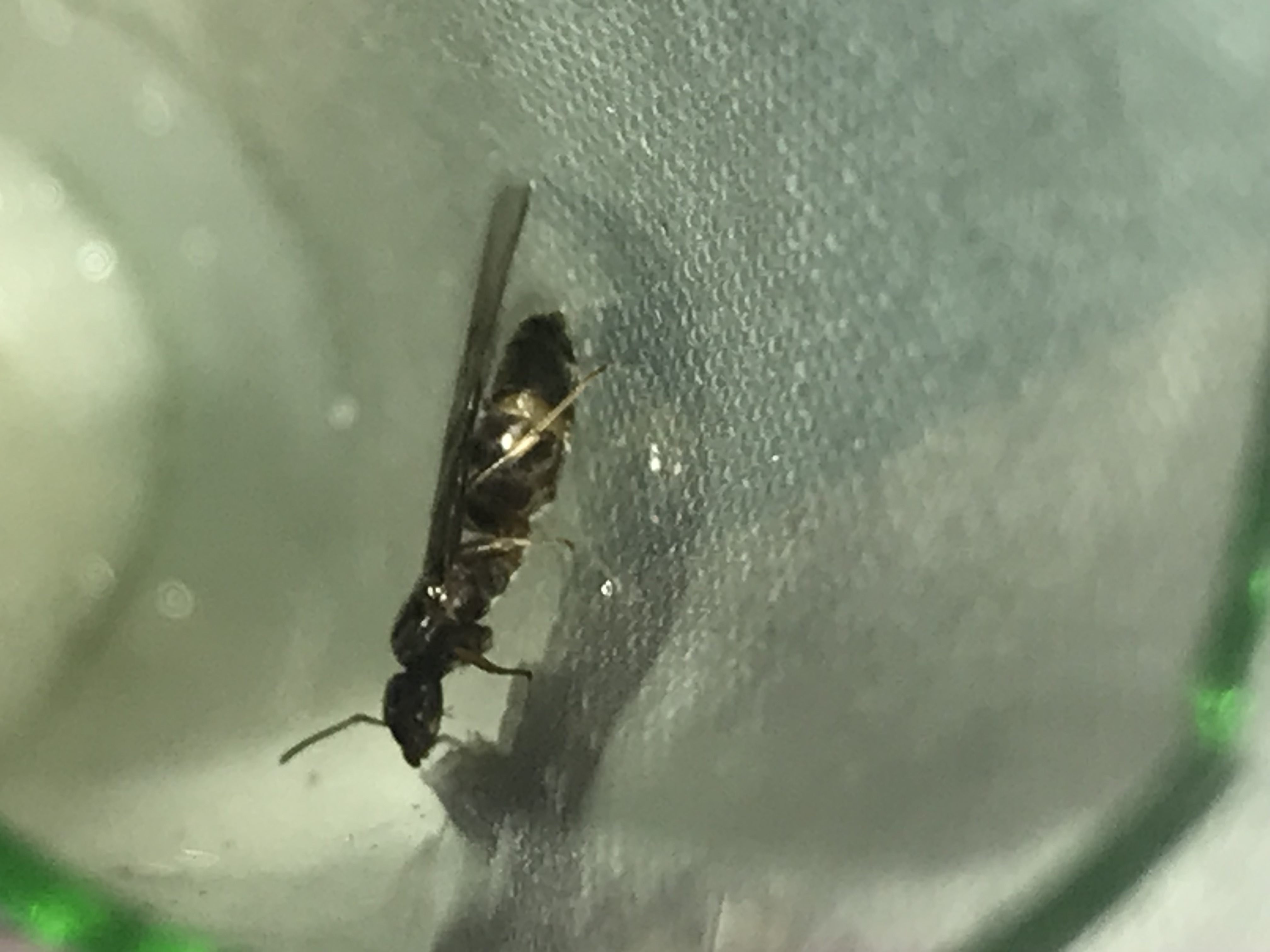 Malheureusement celle-ci est encore ailée (mais bon, mettez vous à ma place, après avoir cherché pendant un mois sans succès et surtout en étant contraint par le temps je l'ai quand même prise), cependant je l'ai laissé dans une bouteille vide toute la nuit et la matinée avec quelques mâles récoltés dans ce parc et plus loin en rentrant chez moi collés à des affiches publicitaires lumineuses. Pour l'espèce ce n'est pas une Pheidole pallidula (le point de l'abdomen qui est contre le thorax n'est pas surélevé et le pétiole en une seule partie).