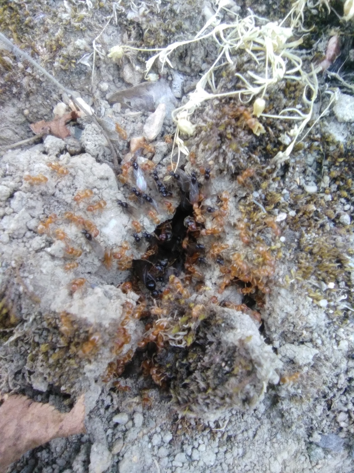 Une autre chose qui me fait dire que l'essaimage a été annulé est le fait que pendant les jours qui ont suivi je continuais de voir le trou grouiller d'or, des fourmis ailées passant de temps en temps derrière la masse. Une chose notable est que l'activité était généralement nettement plus grande de nuit que de jour, pour autant j'ai quand même pu prendre ce genre de photo une après-midi :