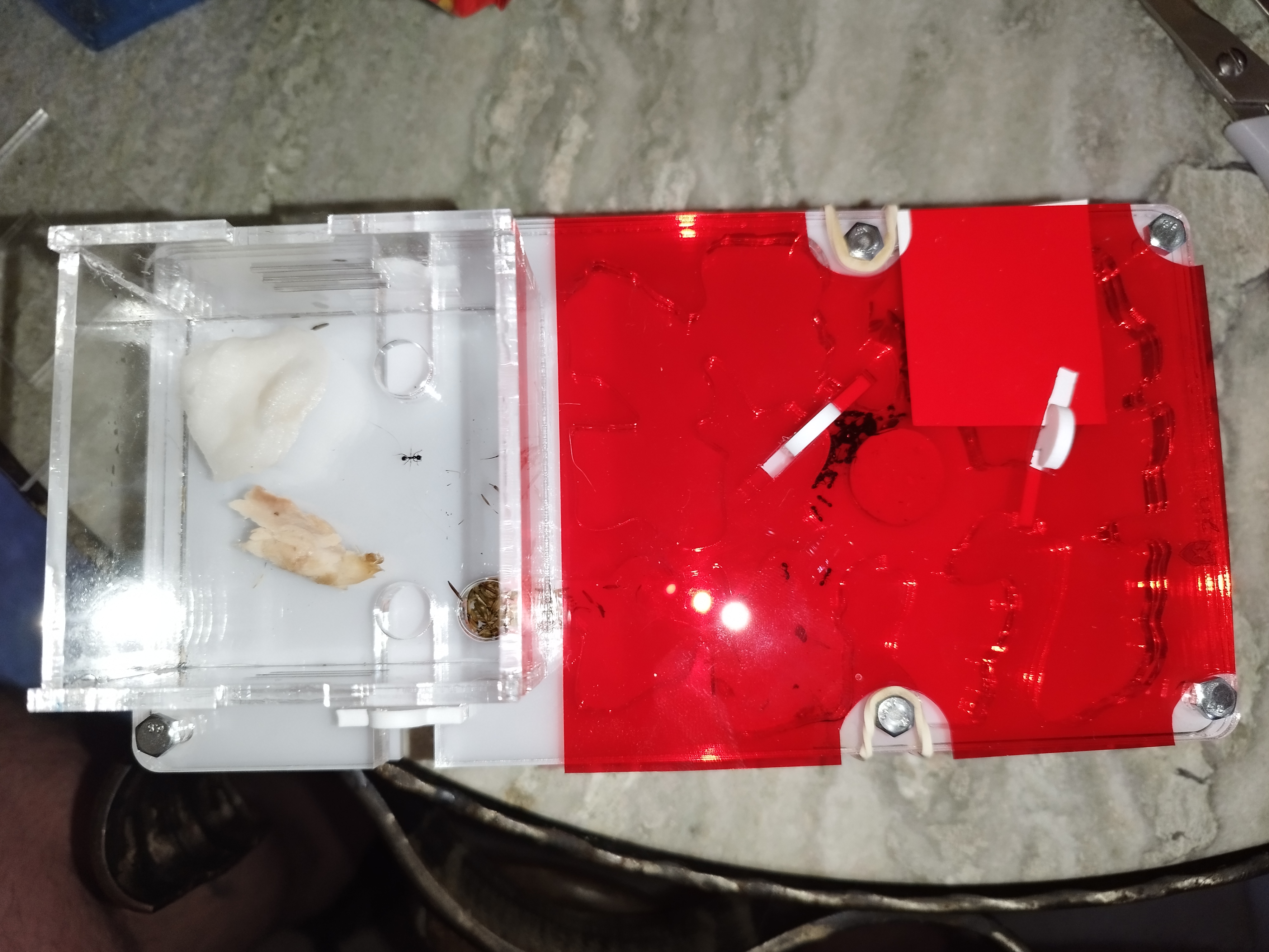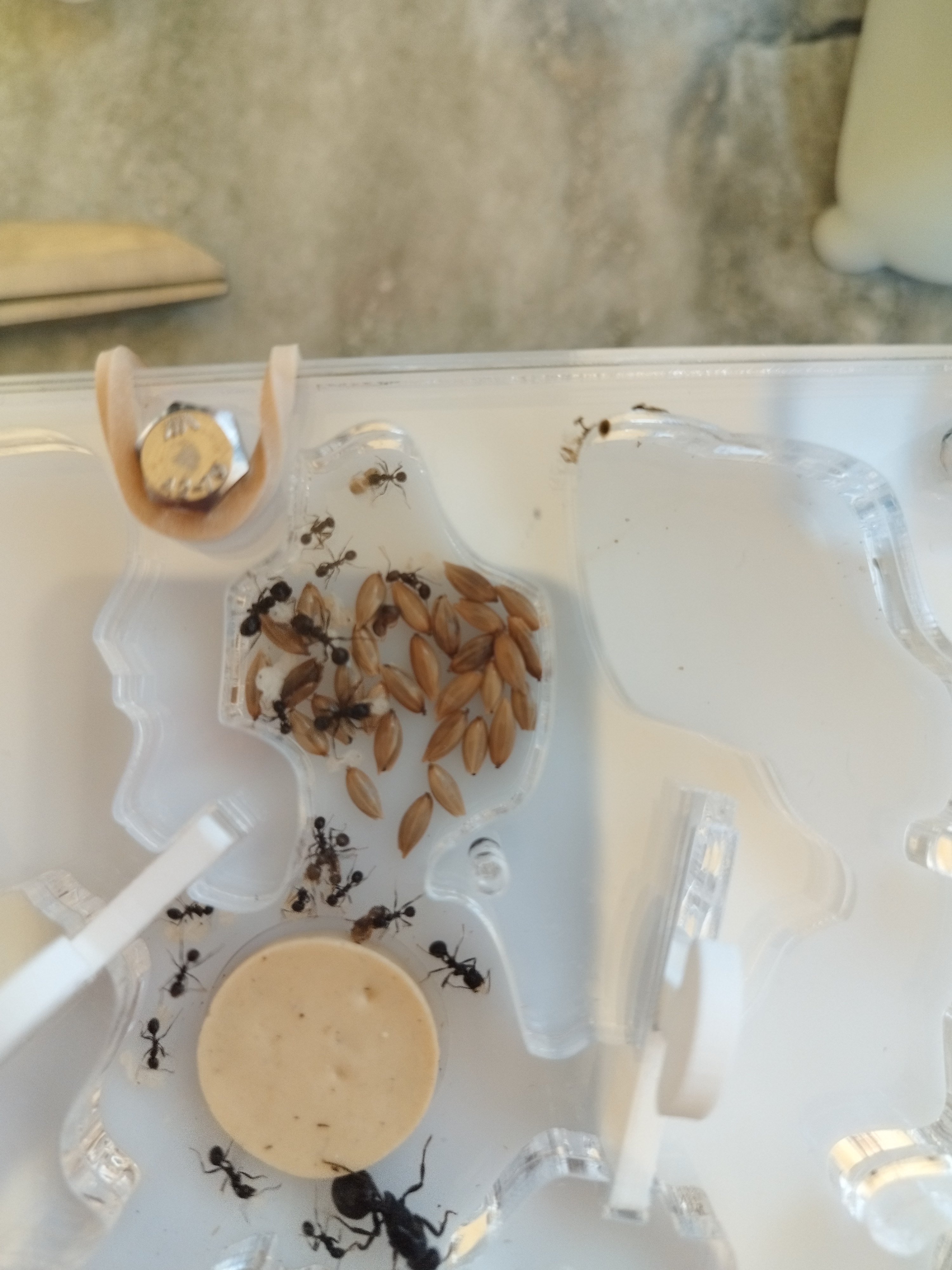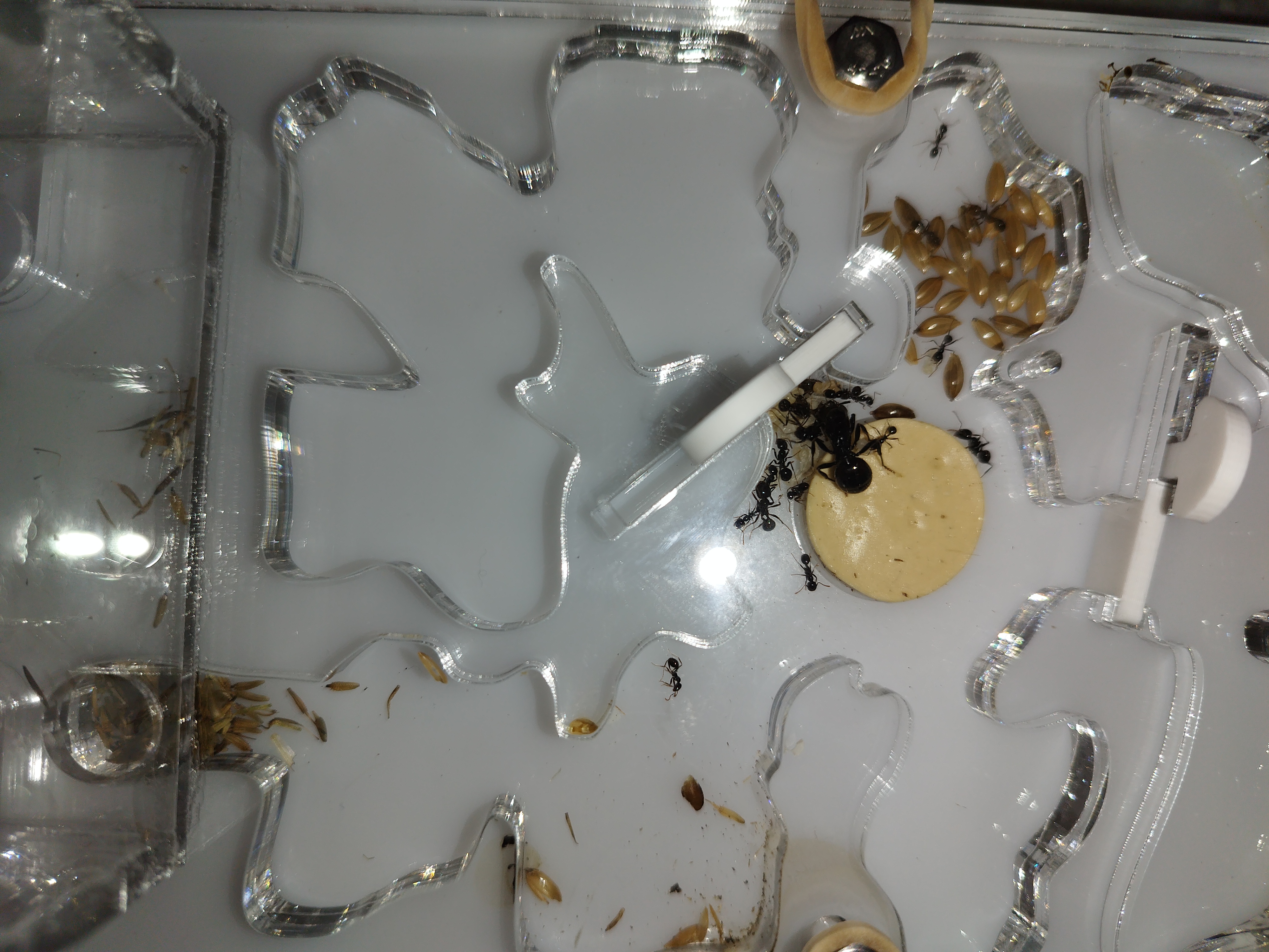 J'essaie de les déranger le moins possible, aussi je les check une fois le matin et une fois le soir, j'ai pas mal lu que le poulet cuit plaît au Messor barbarus (t'as vu @Seed noir j'ai pris en compte tes corrections :D), du coup je leur ai mis à disposition un petit morceau hier soir que je retirerais ce soir. Je trouve des cosses dans l'ADC mais étrangement pas celle du pissenlit.