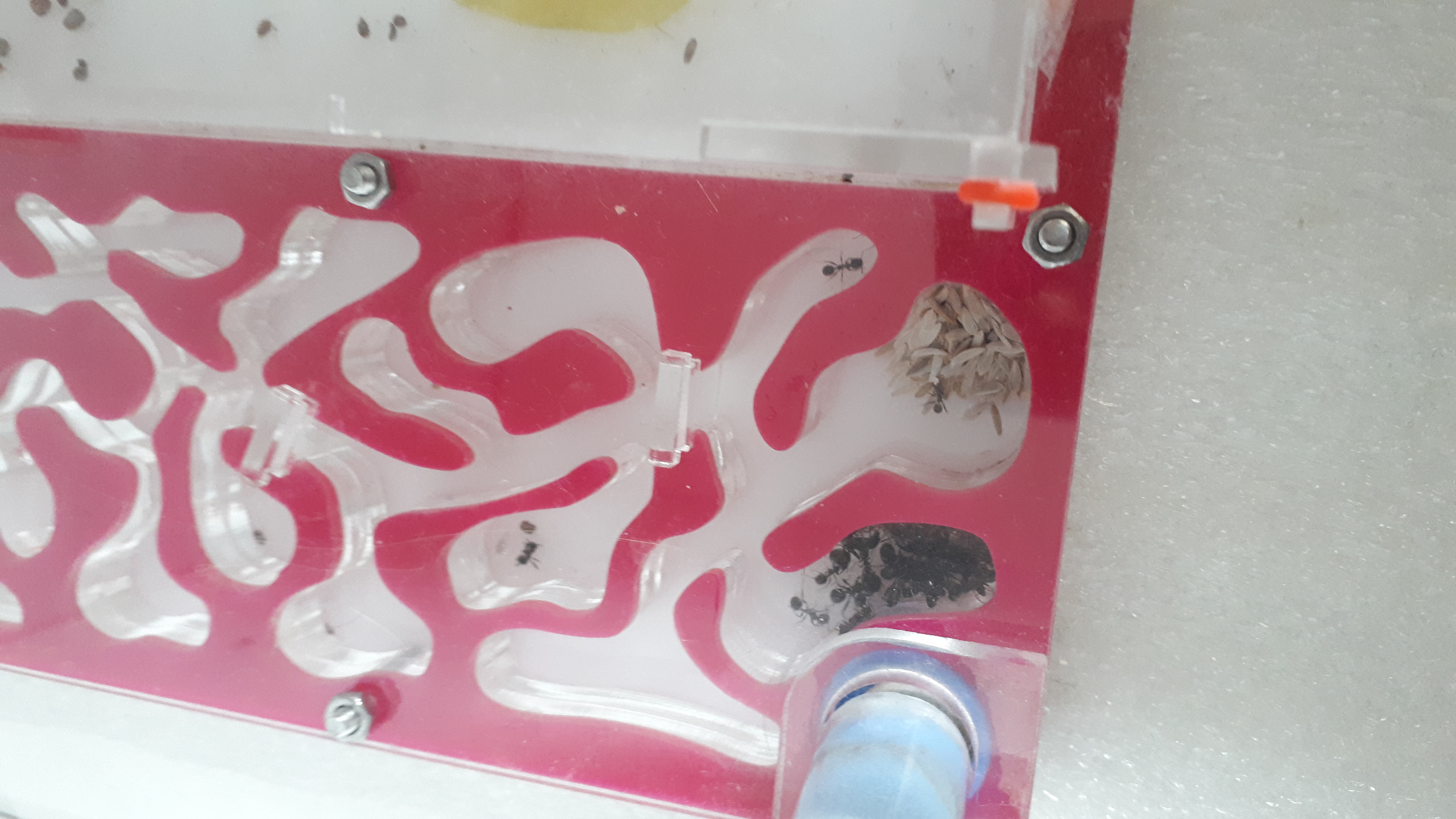 La colonie se trouve encore dans le nid originel, un petit nid en plexiglas avec une adc intégrée acheté pour 20€. Malheureusement même avant cet incident cette demeure avait montré bien des faiblesses : des plaques de plexiglas peu serrées qui avaient causé l'évasion d'une minor qui fut très vite interceptée, une adc peu pratique de part sa hauteur qui ferait suer n'importe qui (trop peu de place pour les soins quotidiens) et un système d'humidité approximatif.