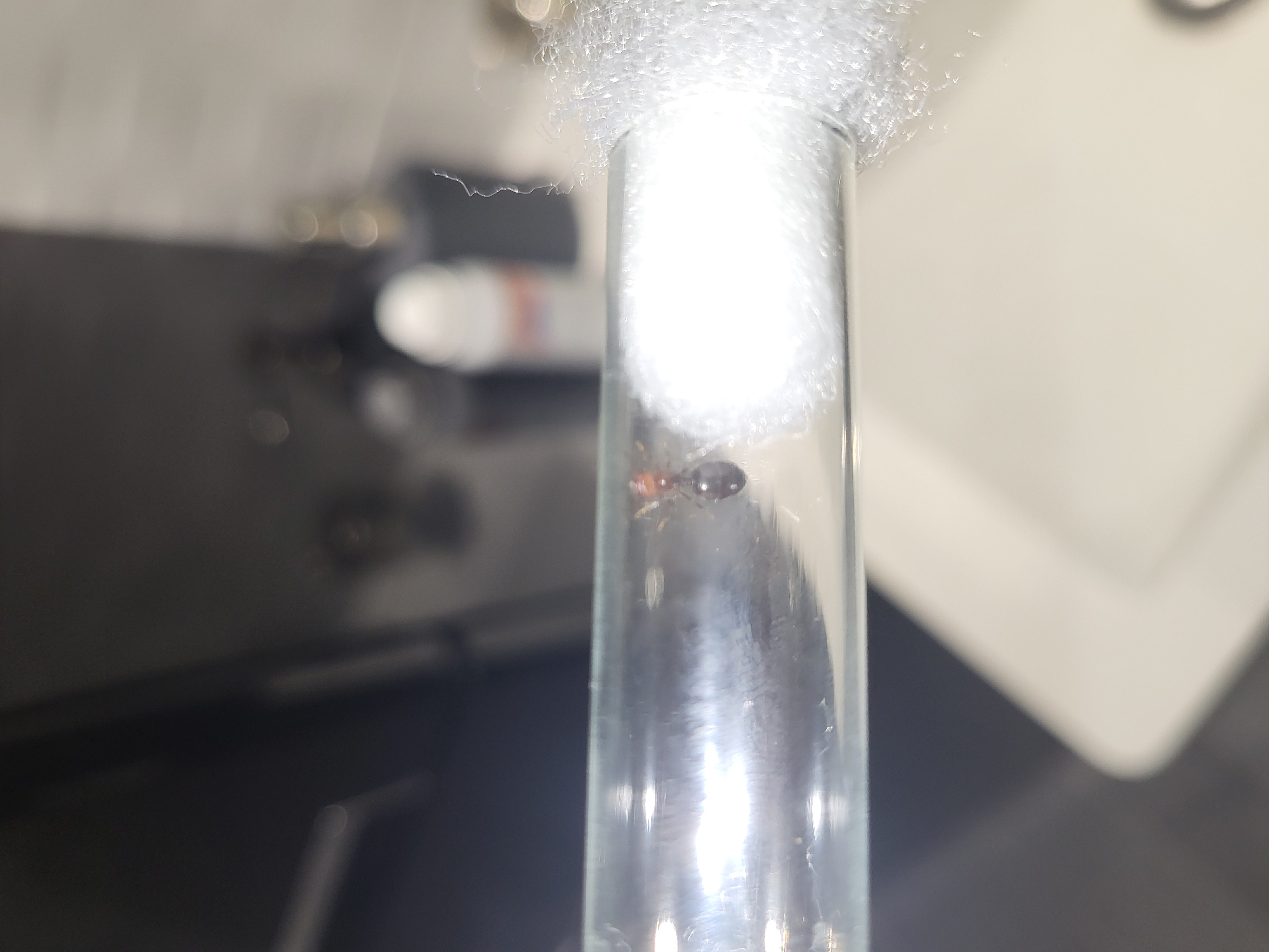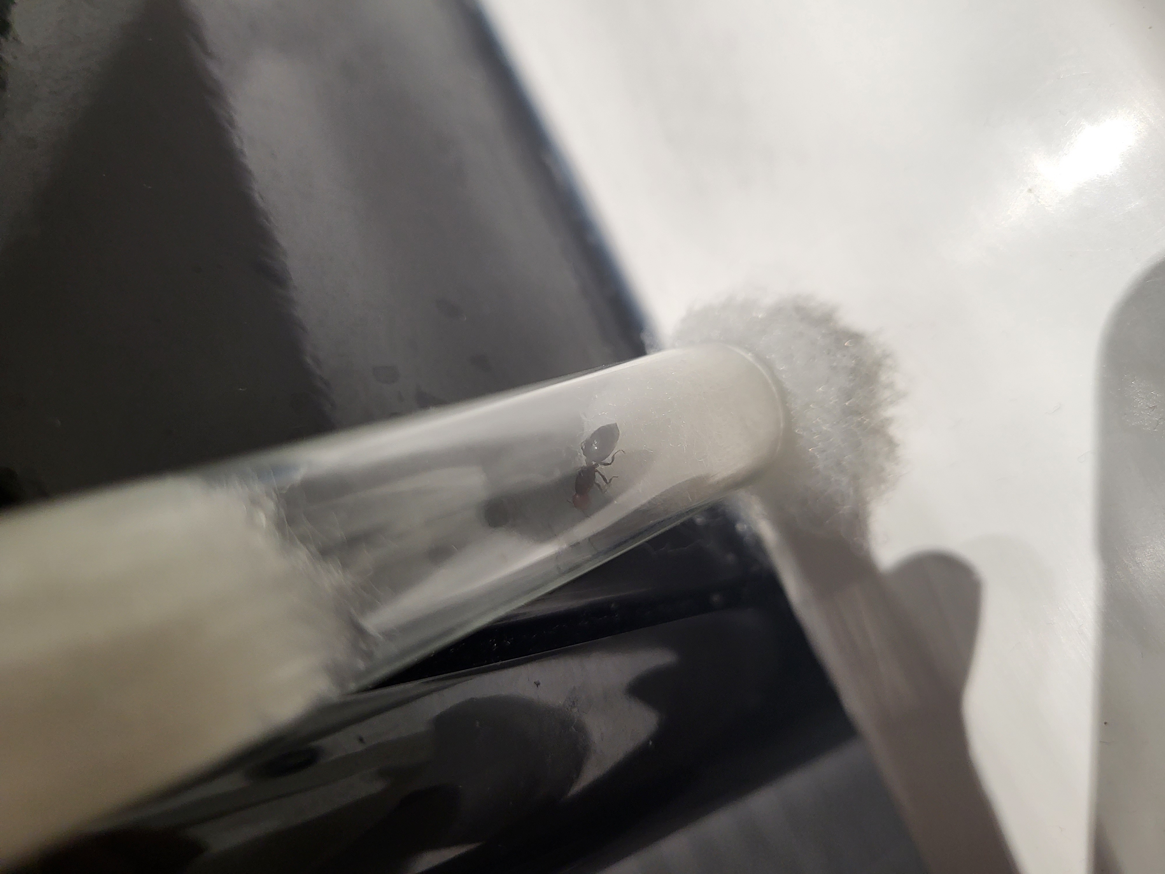 Elle fait tout juste un centimètre, elle est noire avec la tête rouge (le thorax est un peu dégradé).