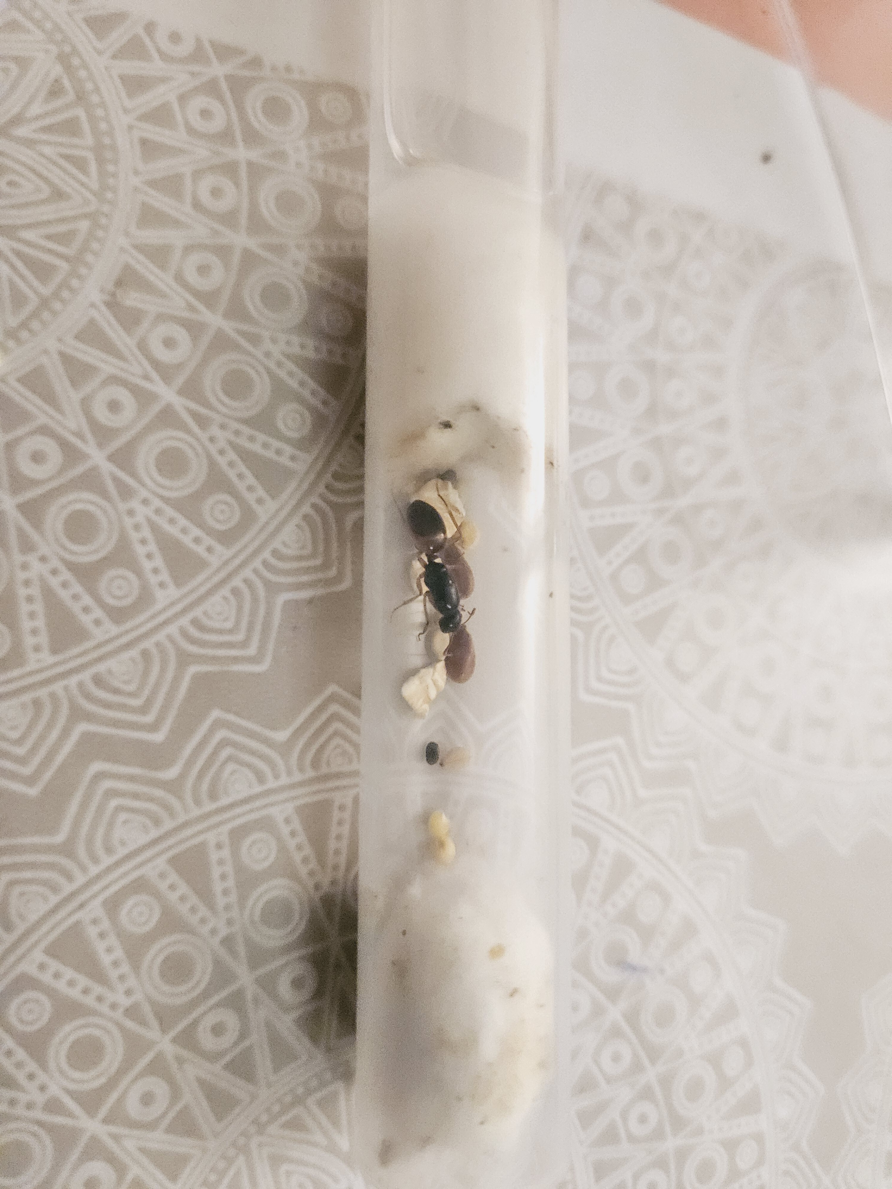 J'ai laissé la reine dans le tube comme vous me l'avez indiqué. J'ai quand même ouvert le tube et mis des graines (livrées avec ainsi qu'avec des insectes) car elle n'avait rien à manger, la pauvre.