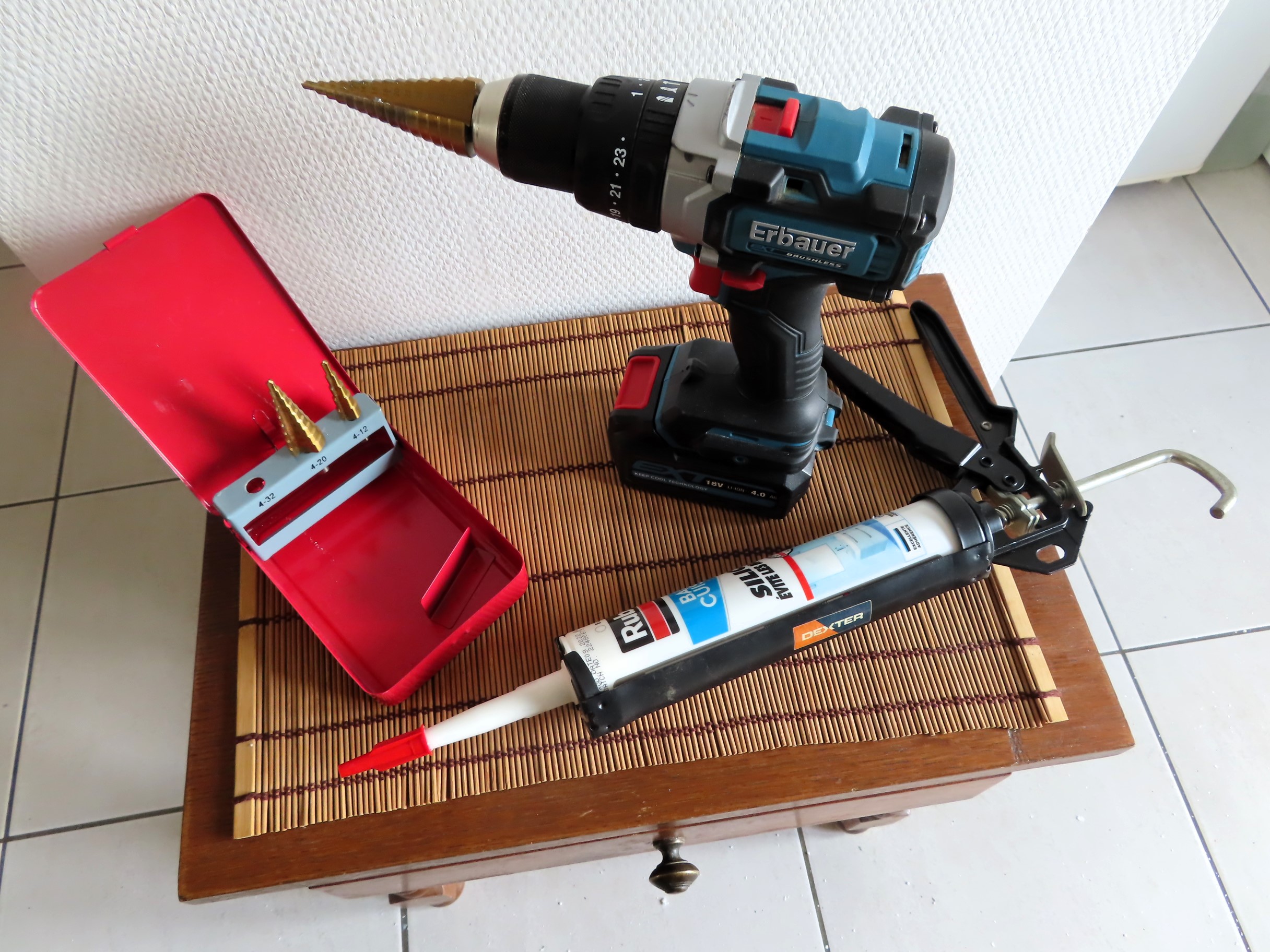 Le cadre en PVC noir et les plaques de polystyrène sont collés au joint silicone blanc. Un trou de 22 mm de diamètre a été percé avec un outil spécial dans le flanc droit de l'ADC pour brancher le tuyau cristal translucide qui en donnera l'accès à mes grosses fourmis noires parce que « Noir c'est noir, etc ».