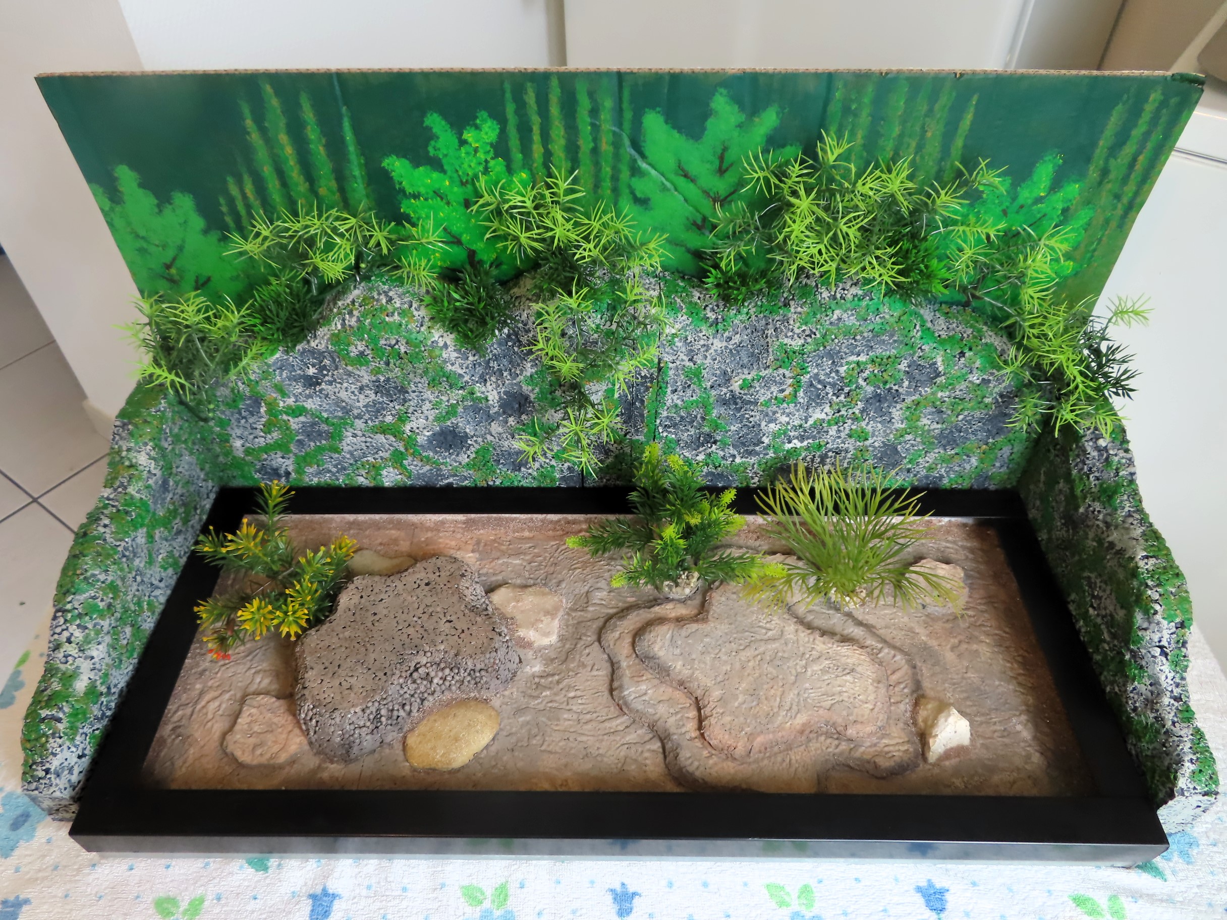Son fond est en polystyrène expansé de 6 mm d'épaisseur présentant des petits reliefs sur une face, ce qui fait plus naturel une fois peint. J'y ai ajouté par dessus d'autres plaques découpées en zigzag ainsi qu'un bloc un peu plus épais pour faire des sortes de promontoires qui accueilleront plus tard des bouchons nourrisseurs.