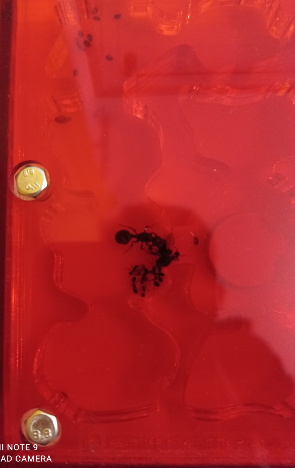 La colonie se développe bien, les Messor savent utiliser leurs pattes pour tenir des objets le temps de bien positionné leurs mandibule, j'ai bien trois major qui commencent à être moins peureux contrairement à mes minor qui attaquent tout ce qui bouge.