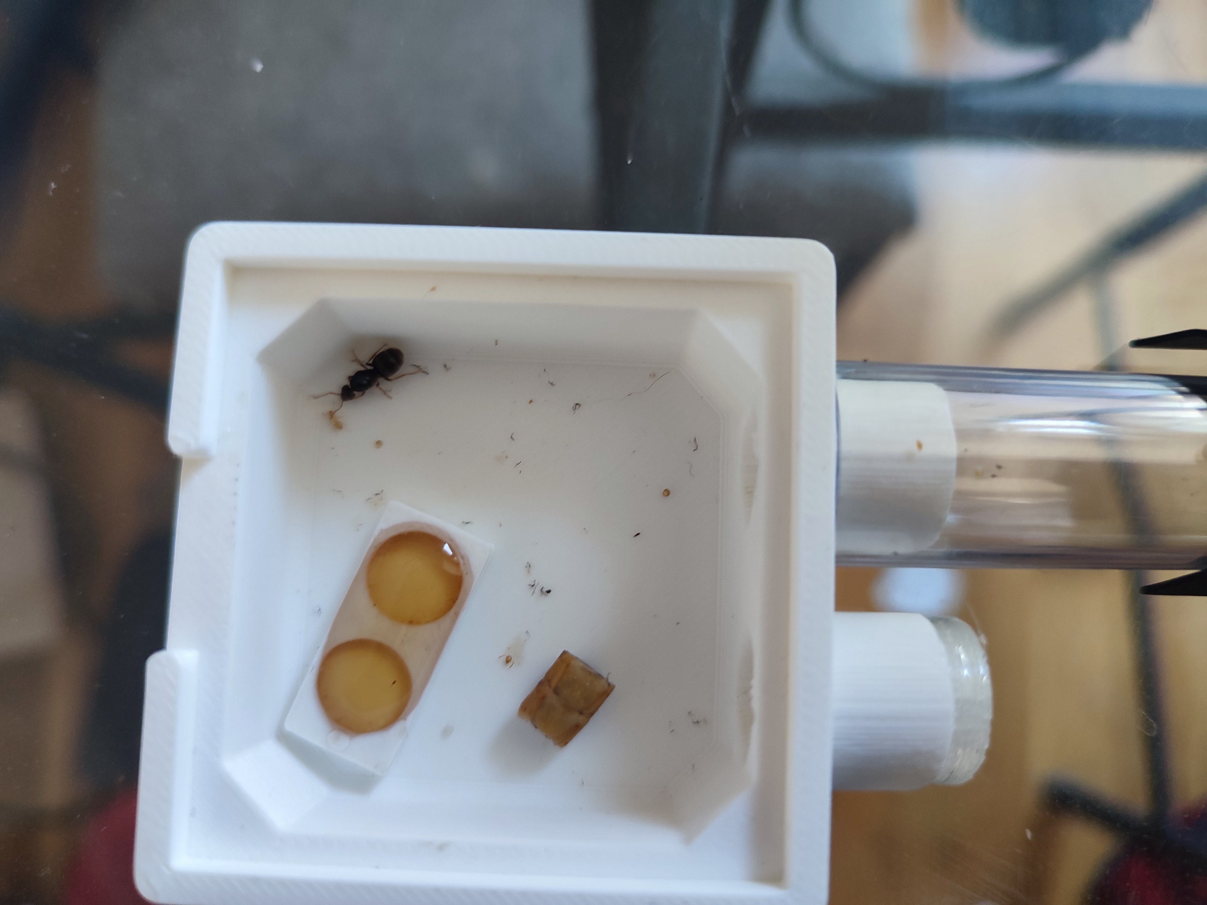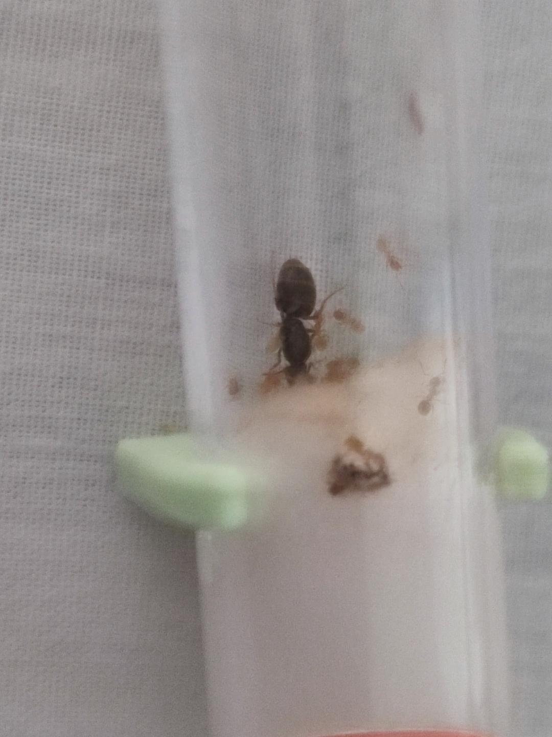 Je m'appelle Maya, je suis une gyne Lasius flavus, je dois mon petit nom à ma couleur miel, enfin, surtout à celle de mes filles, et je compte bien devenir une reine digne de son nom avec des centaines d'ouvrière à mon service pour répondre à mes besoins et étendre mon empire. L'humaine qui s'occupe de moi à déjà bien honoré ma personne en m'offrant un liquide sucré que mes ouvrières ont englouti avec plaisir avant de m'y faire gouter. Elle a aussi eu la bonne idée d'offrir un morceau de mouche pour nourrir mes larves, même si mes ouvrières, un poil téméraire, ont décidé de me l'amener directement, j'ai dû leur dire de le ramener à l'entrée de notre tube, ma noble personne ne doit pas être mise en contact avec une vulgaire mouche, même morte et en morceaux.