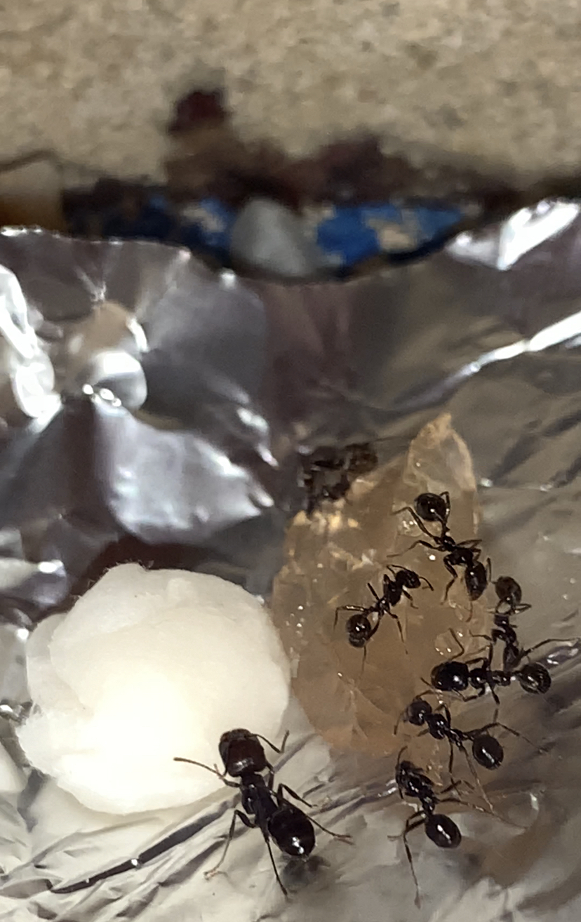 En mai, le développement était très très lent, donc début juin, j’ai fini par déplacer la fourmilière dans un tiroir, dans ma chambre, pour les laisser tranquilles le plus possibles (en ne les « dérangeant » que pour ravitailler 2 fois par semaine et les prendre en photo pour les compter). J’ai augmenté la quantité d’eau (par rapport au « mode d’emploi) et j’ai l’impression que ça leur a plu. La reine a recommencé à pondre, doucement, mais sûrement. L’été s’est passé au même rythme, et fin août le nombre d’ouvrières (et soldat et major) était d’environ 25. J’ai lu que pour cette espèce, le développement est lent, mais c’est quoi « lent » exactement ???