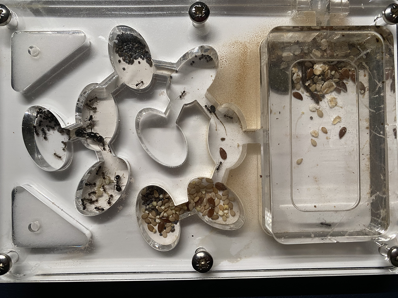 C’était un kit pédagogique, donc avec tout dans la boîte. J’avais un tube à essai avec 1 reine, 8 ouvrières et des œufs/larves, une petite fourmilière, ma nourriture…