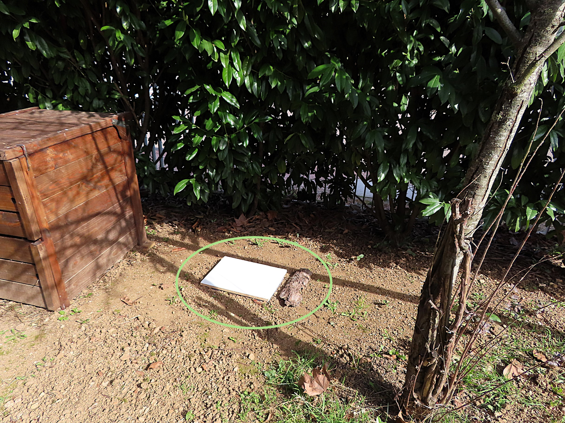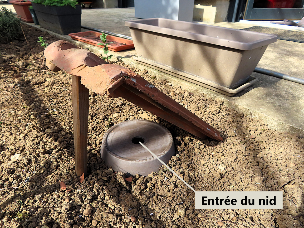 En 16 ► Cette plaque je l'ai trouvée dans le local poubelles de mon immeuble. Elle recouvre pile/poil la boîte et est assez lourde pour ne pas s'envoler par fort coups de vent. Je pourrai même, au besoin, rajouter une lourde pierre par dessus pour mieux l'immobiliser. Quant au déboucher du tube en surface, il sera lui aussi protégé, c'est-à-dire recouvert par une sorte de auvent qui le protégera surtout de la pluie mais qui n'empêchera pas les bourdons d'aller et venir sans gêne.