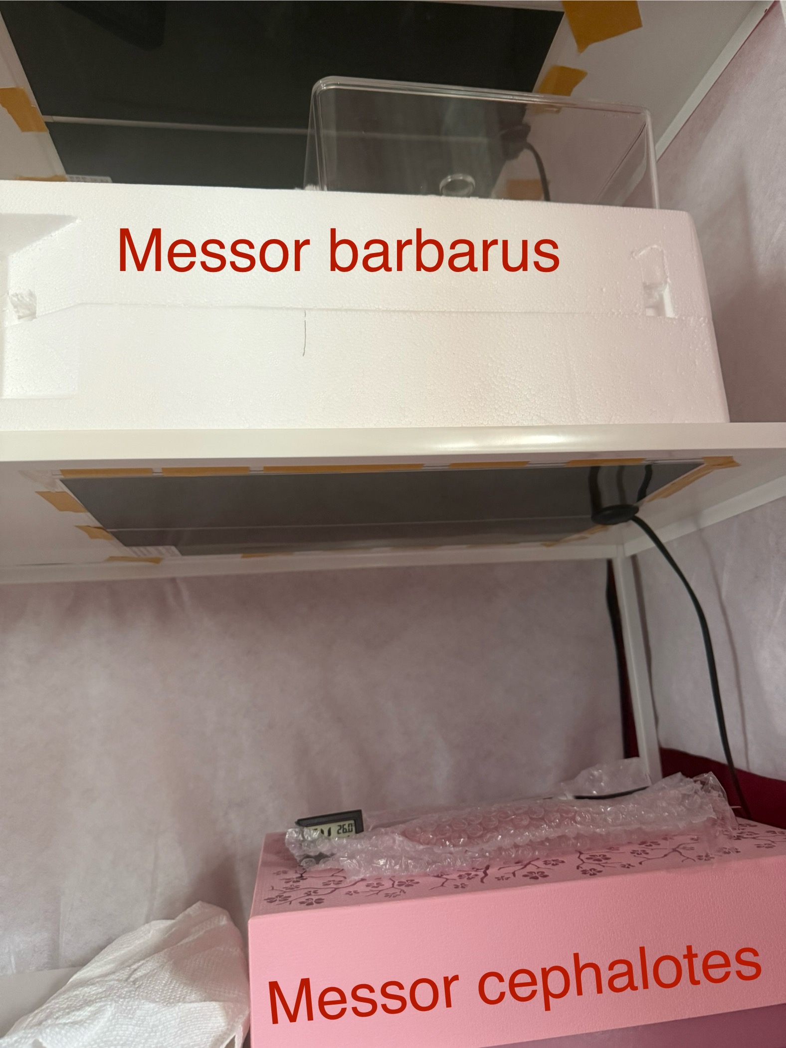 Mon installation : La reine est actuellement dans son tube à essai, placée sous mes Messor barbarus à l'étagère du dessous, ce qui permettra de recevoir une source de chaleur en plus grâce à sa voisine du dessus étant donné que je place les tapis chauffants par le dessus.