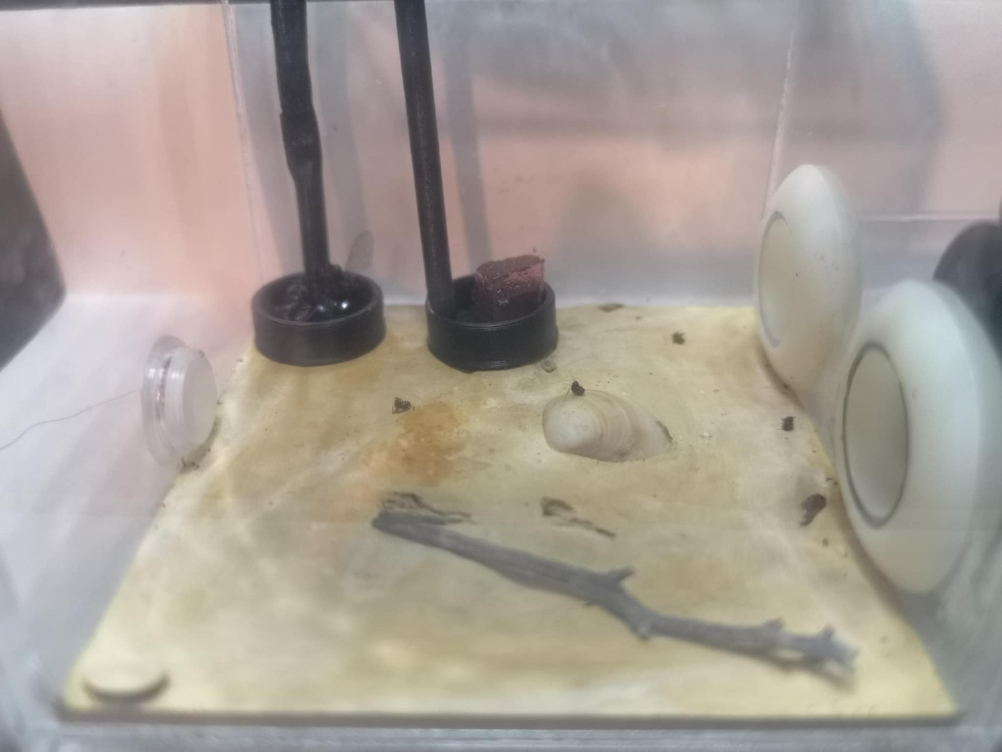 Une nymphe nue est en train de se faire dévorer, ou trimbaler d'un bout à l'autre de l'aire de chasse. D'après ce que je lis, il doit y avoir trop d'humidité dans l'aire de chasse. Suivant les conseils du forum, j'enlève donc le coton et l'eau du tube à la lumière ainsi que l'abreuvoir.