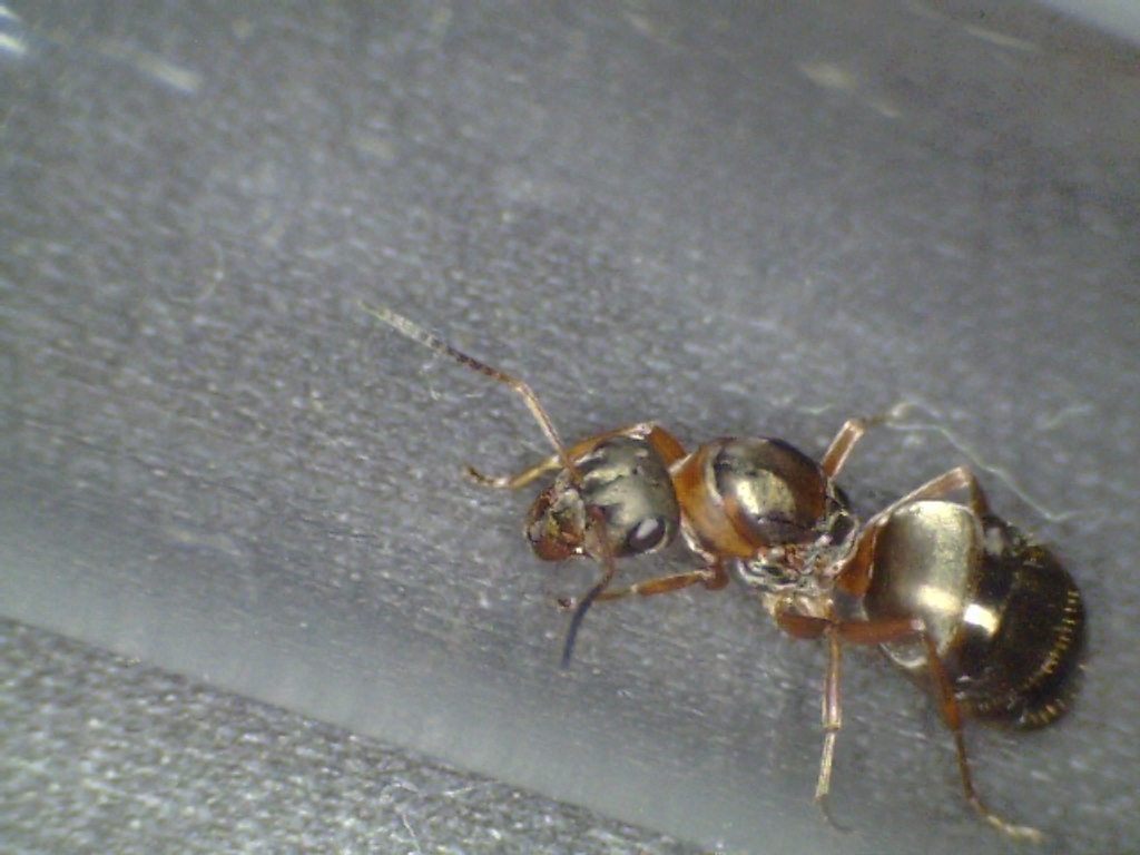 Pour la deuxième, c'est plus compliqué. J'ai suivi le site de clé fourmis pour tenter d'identifier mais à une étape le critère est : "front luisant" ou "front mat". Avec les LED de mon microscope ça luit de toute façon ! Alors j'ai continué dans les 2 cas possibles. D'un côté je tombe sur Formica rufa et dans ce cas je crois que je n'ai plus qu'à la relacher. Avec l'option "front mat", j'en arrive à Formica cunicularia...