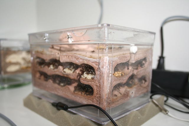 La fourmilière complétement cachée par une serviette pour ne pas les stresser: