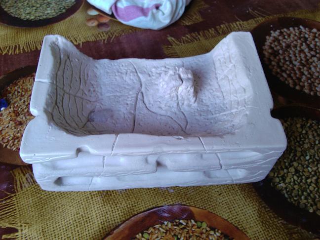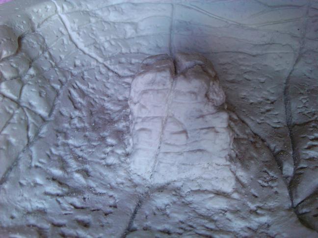 Sixième étape : Avec un couteau, un tourne vis plat, un pinceau, une brosse à dent ou tout autre objet, on sculpte à notre guise le plâtre ( pour ma part, j'ai copié sur un site