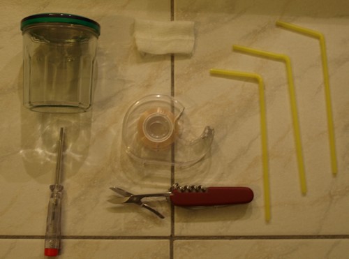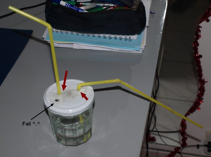 Pour enfoncer les morceaux de paille 1 & 2 dans le couvercle, je l'ai percé avec un tourne-vis. Mais attention, manip' dangereuse, le couvercle étant lisse/glissant, le coup de tourne-vis ripe vite et gare aux doigts. J'ai utilisé un tourne-vis car je n'avais rien d'autre sous la main, mais si vous avez une autre idée, c'est pas plus mal.