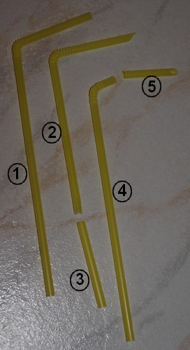 Pour l'assemblage des pailles, si on coupe dans la longueur le biseau (seulement) des paille biseautés, cela aide à les encastrer les unes avec les autres (les deux lamelles ainsi crées se chevauchent et forment en diamètre inférieur à celui du tube coupé droit).