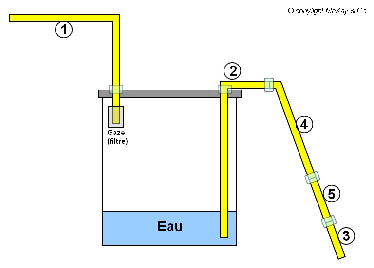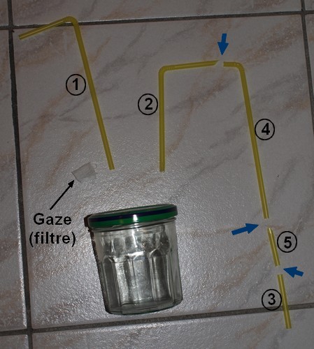 Le morceau de gaze sert de filtre en plus du piège qu'est l'eau histoire de pas avoir de flotte dans le tube d'aspiration (due aux éclaboussures).