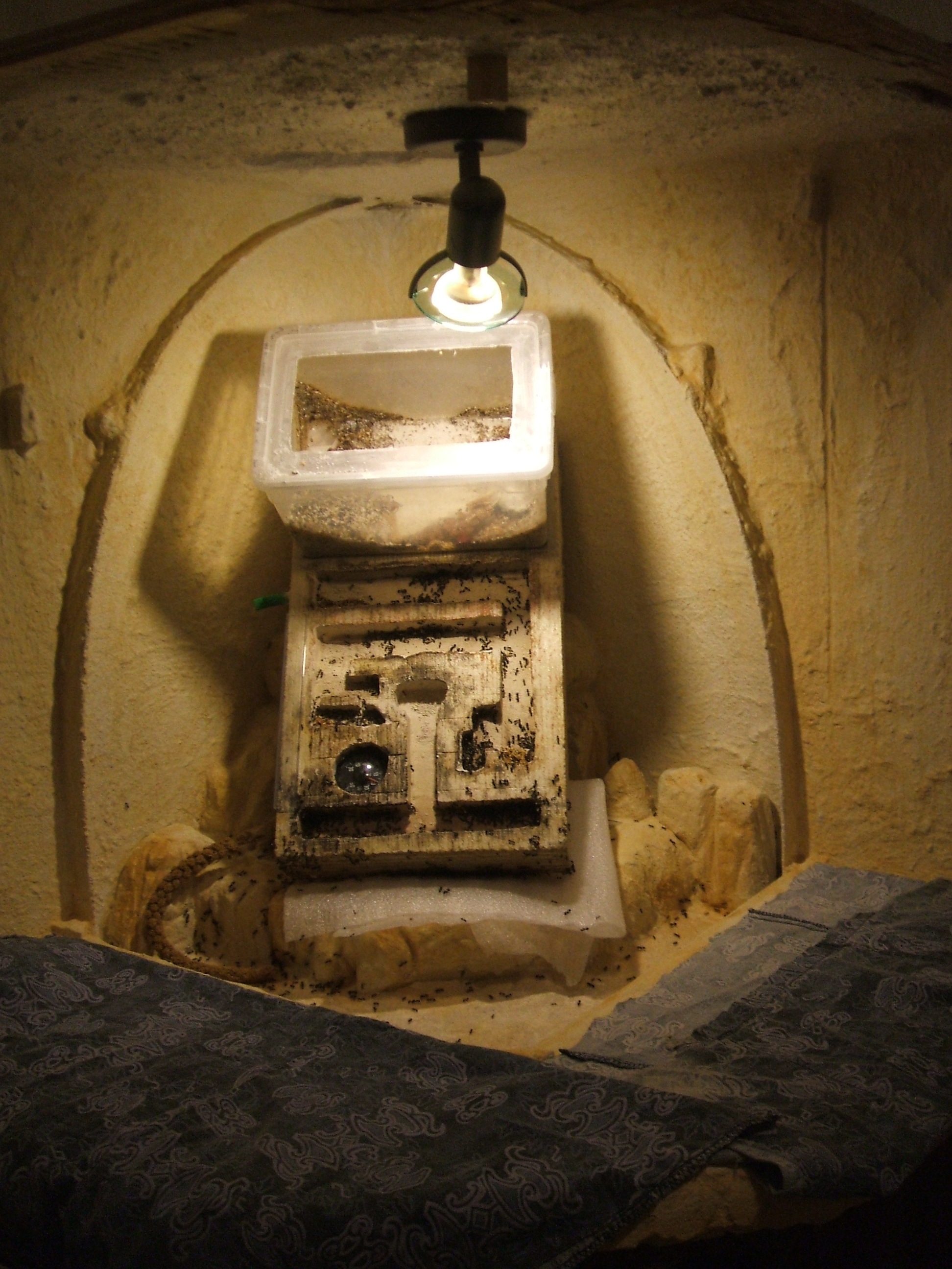 En définitive, l'endroit se prête bien à l'élevage de fourmis: l'un des plus calmes de la maison, loin des télévisions et des enceintes. C'est aussi l'un des plus sombres: la lumière du jour ne dérangera pas et la faible luminosité du spot (7W) suffit à y mettre le décor en valeur.