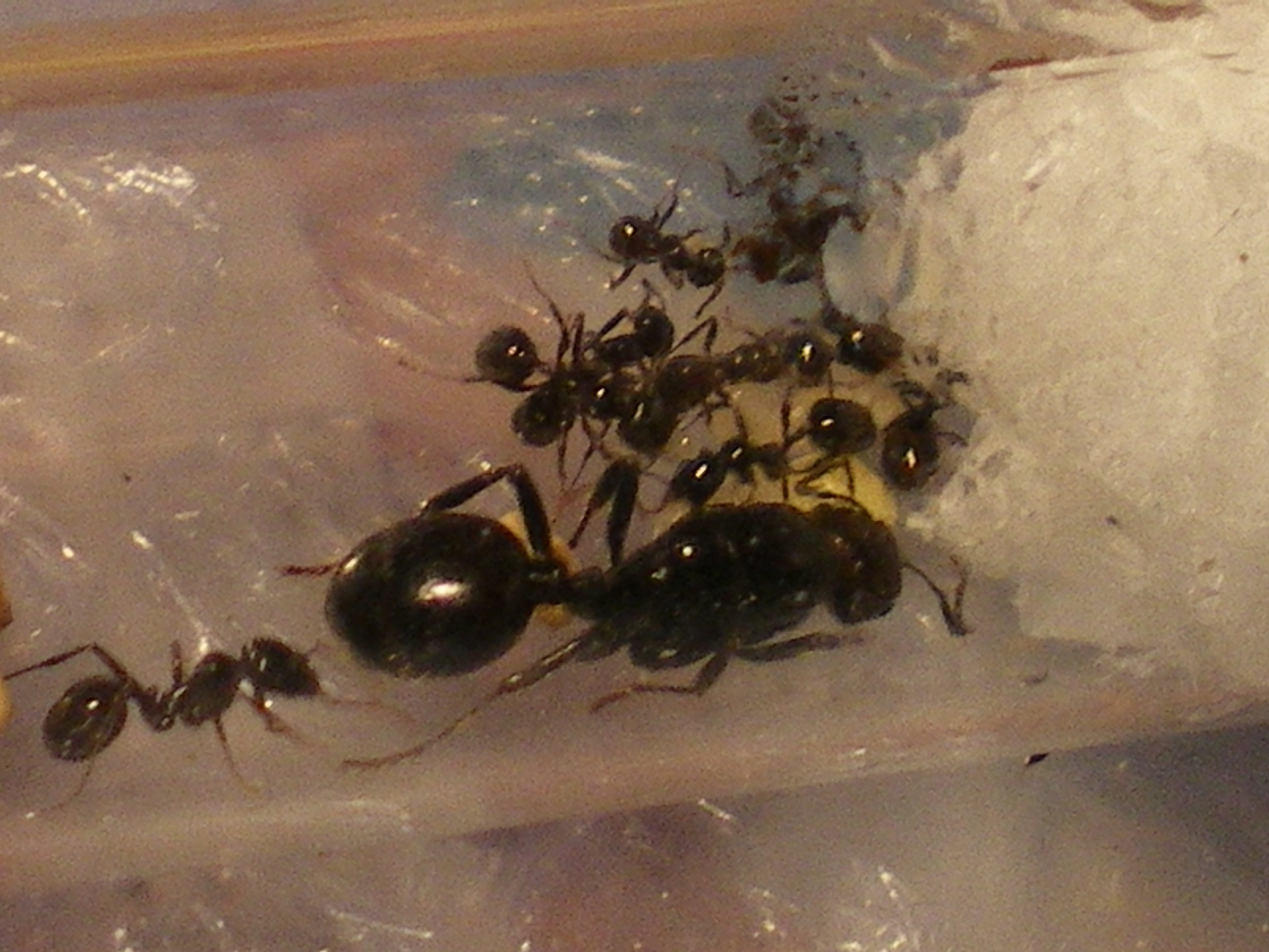 La première, de Lasius niger, a été commandé sur internet, un "kit pour débutant", j'ai donc reçu le 20 avril la gyne avec 30 ouvrières et quelques larves et cocons. Une petite photo de leur arrivée, déja en train de boulotter un "cousin" !!