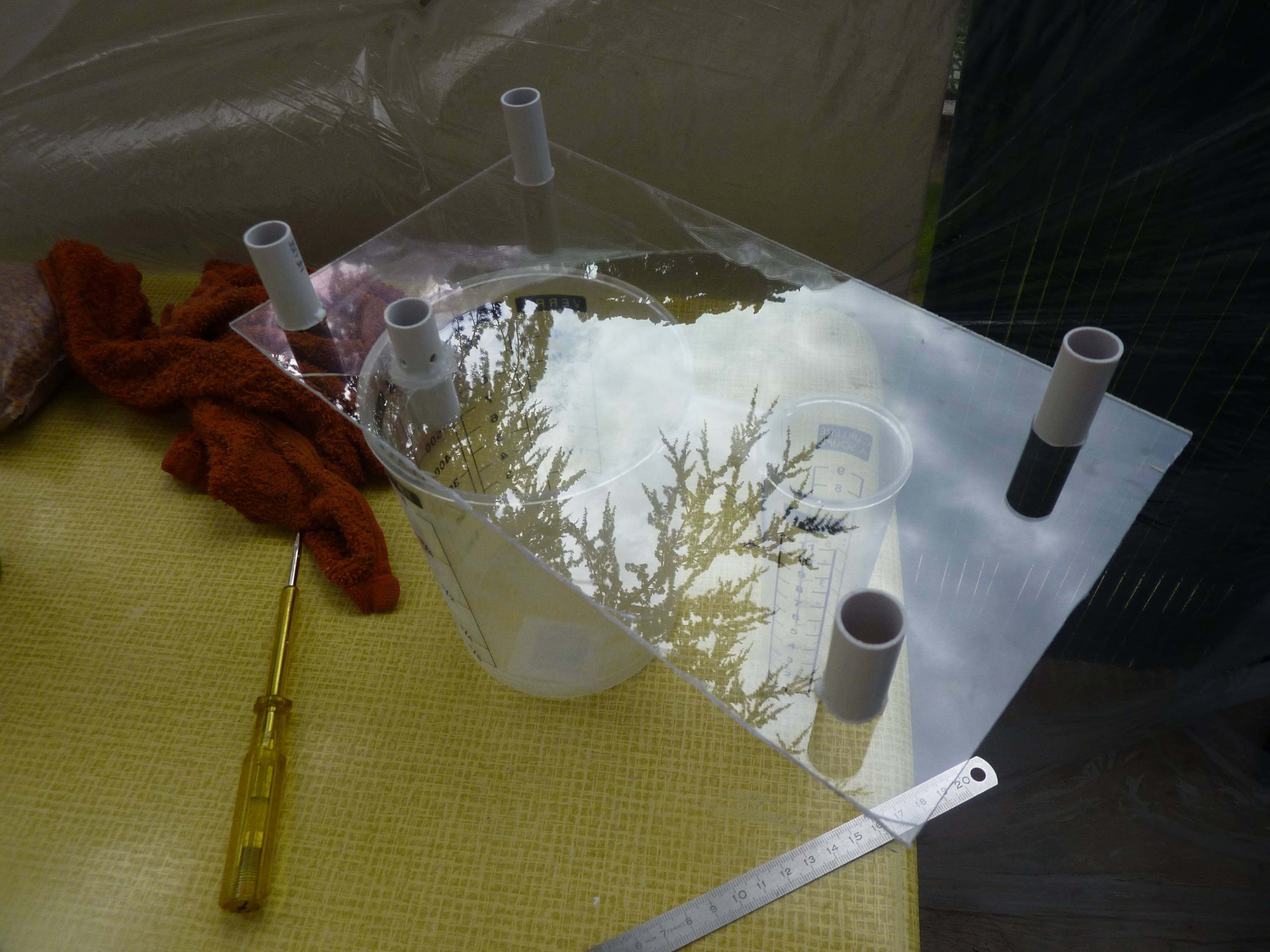 On colle les tubes et le tube de liaison pour remplir la réserve d'eau, sur la plaque de plexi: