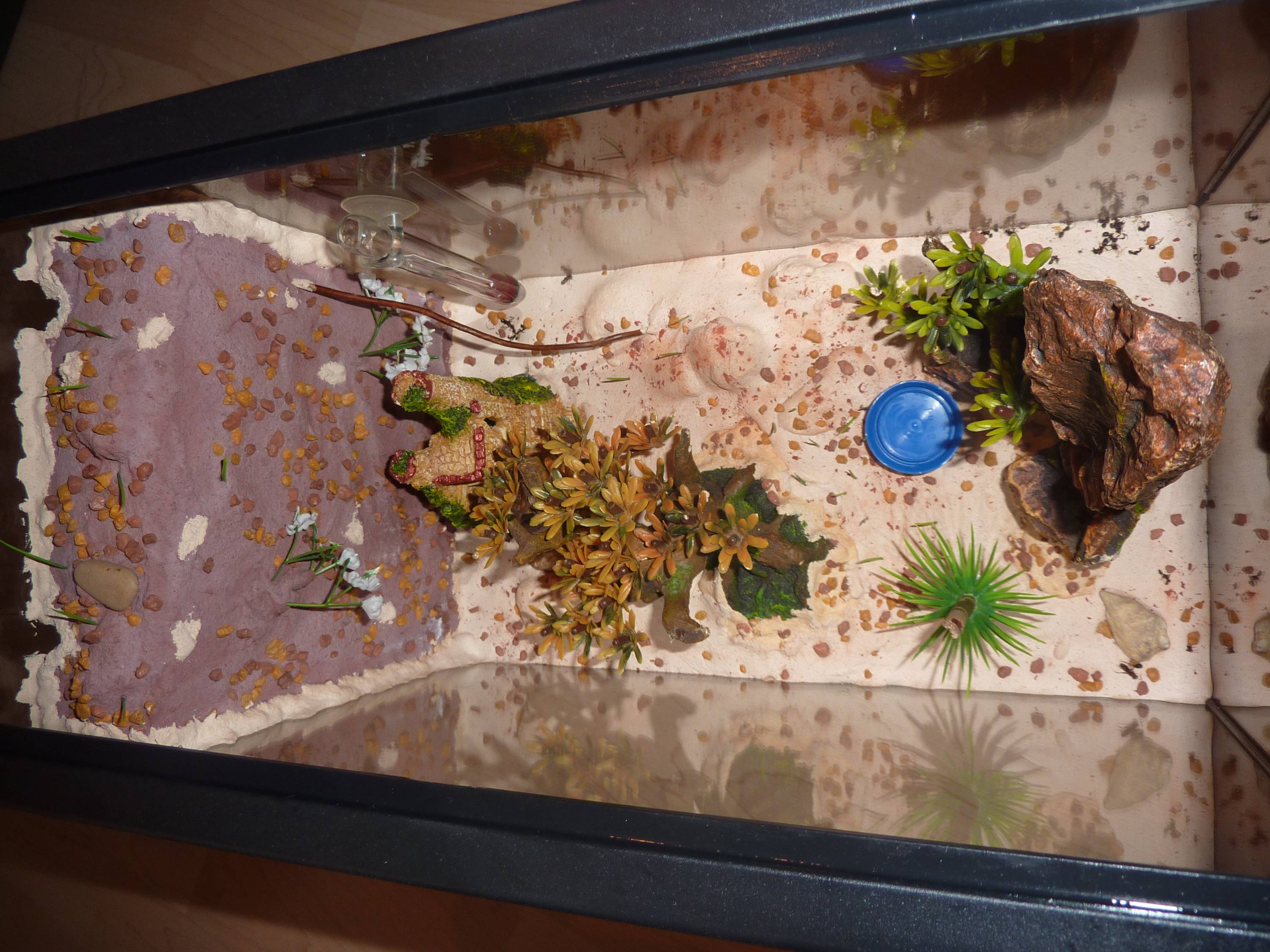 Pour la suite je n'ai pas fait de photo lors de la création du décor. J'ai utilisé le mortier colle BC pour faire le décor, mélangé avec du pigment naturel orange (me rappelle plus le nom exact :-p ). J'ai disposé des cailloux sur lequel j'ai coulé le mortier, pour donner l'effet de petites montagnes. Les fleurs, arbres, petit cailloux sont des accessoires d'aquariophilie qui sont intégrés au mortier lors du "coulage". J'ai ensuite saupoudré le décor avec du sable fin et du pigment naturel rouge (pour mon prochain terra, j'étalerai au pinceau directement le pigment sur le décor sec, ça donne un effet super joli).