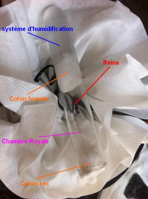 Installation en tube à essai avec un système d'humidification (réserve d'eau), une chambre royale séparée par un coton humide entre la réserve d'eau et la chambre royale. Puis, un coton sec pour bloquer la sortie du tube à essai tout en laissant passer l'air suffisante pour la Reine (gyne). Cette installation est très conseillée pour débuter un élevage de fourmis avant de passer aux prochaines étapes (zone de chasse, béton cellulaire, etc). Si vous respectez cette méthode, vous pourrez vous apercevoir que votre Gyne ne voudra pas en sortir et vous apporterez une humidité suffisante pour l'espèce que vous avez choisi.
